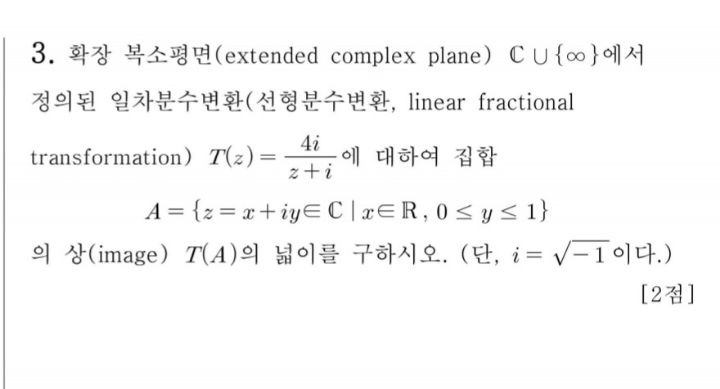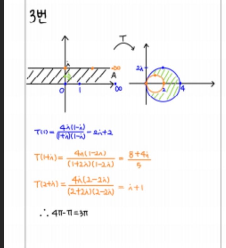 작성자심대원 작성시간 23.06.02 세 점을 지나는 원은 유일하게 결정됩니다. 답안에서는 0, 1, ∞를 보낸 세 점과 1+i, 2+i, ∞를 보낸 세 점을 지나는 원을 각각 구한듯합니다.