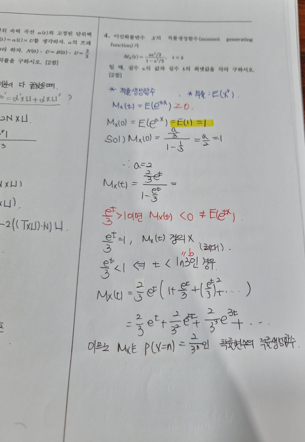 [확률과 통계학]실전모고 3회 A04 적률생성함수 평균(심) 작성자청하|작성시간23.11.10|조회수99 목록 댓글 1 글자크기 작게가 글자크기 크게가 형광펜친 E(1)이 왜 1일까요? 다음검색 현재 게시글 추가 기능 열기 북마크 공유하기 신고 센터로 신고 댓글 댓글 1 댓글쓰기 답글쓰기 댓글 리스트 작성자심대원 | 작성시간 23.11.13 E(1)은 확률변수가 1일 때의 기댓값입니다. 확률변수를 X라 하면, X=1이면 가질 수 있는 값이 1뿐이므로 X=1일 때 확률 1, 나머지 경우 확률 0입니다. 그러므로 기댓값도 1입니다. 댓글 전체보기