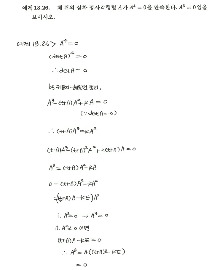 여기에서 마지막에서 네번째 줄에 A^2=0이 아닌경우 (trA)A-KE=0 이라고 했는데 왜 그런건가요?