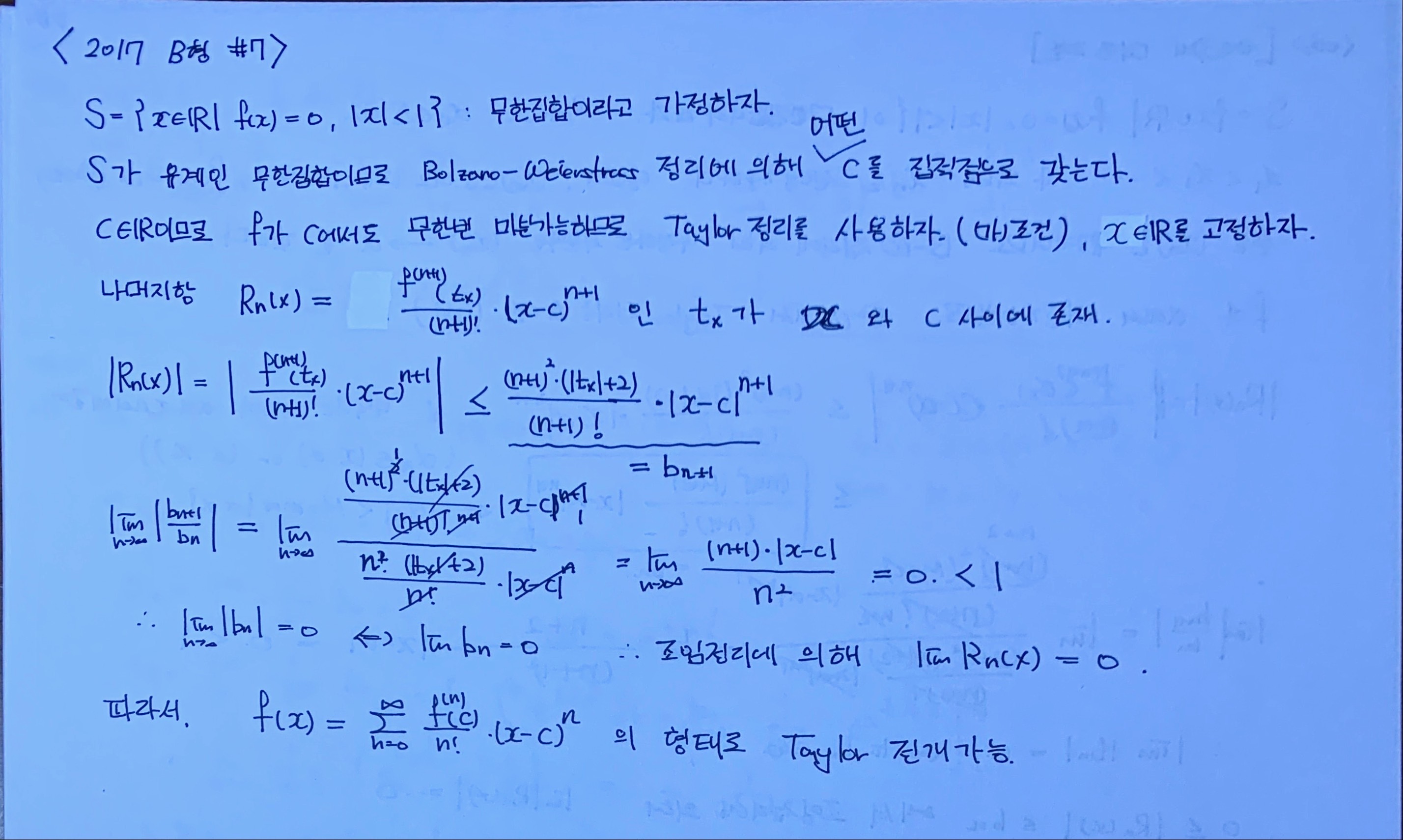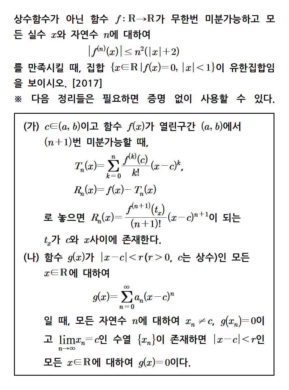 답댓글 작성자신선물고기 작성시간 20.06.05 쿠크쿠크 이 문제는 급수 수렴 반경과 무관합니다. 아무리 좋은 수렴을 하는 테일러 급수를 가지는 함수라도 실변수함수는 그것만으로 테일러 급수전개 가능성 보장 없습니다. 다만 그런 함수는 도함수 값이 미분 하면할 수록 아주아주 커지는 경학이 있습니다. 이 문제는 그런 특성을 활용하여 출제한 문제로 도함수가 다항식 정도로 바운드되면 무조건 테일러 급수전개 가능함을 이용하는 문제입니다. 나머지 항을 봐야하며 급수에 집중하면 못 풉니다.