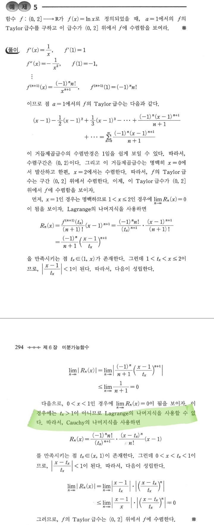 작성자신선물고기 작성시간 20.07.29 두번째로 테일러 정리를 활용하더라도 실제 시험에서 나머지식을 모두 기억하고 세밀하게 적용하기는 어렵습니다. 대부분 경우 내점에서 라그랑지 나머지식의 적용으로 충분하고 경계부분에서 수렴은 따로 증명한 후 아벨정리를 적용하면 될 일입니다.