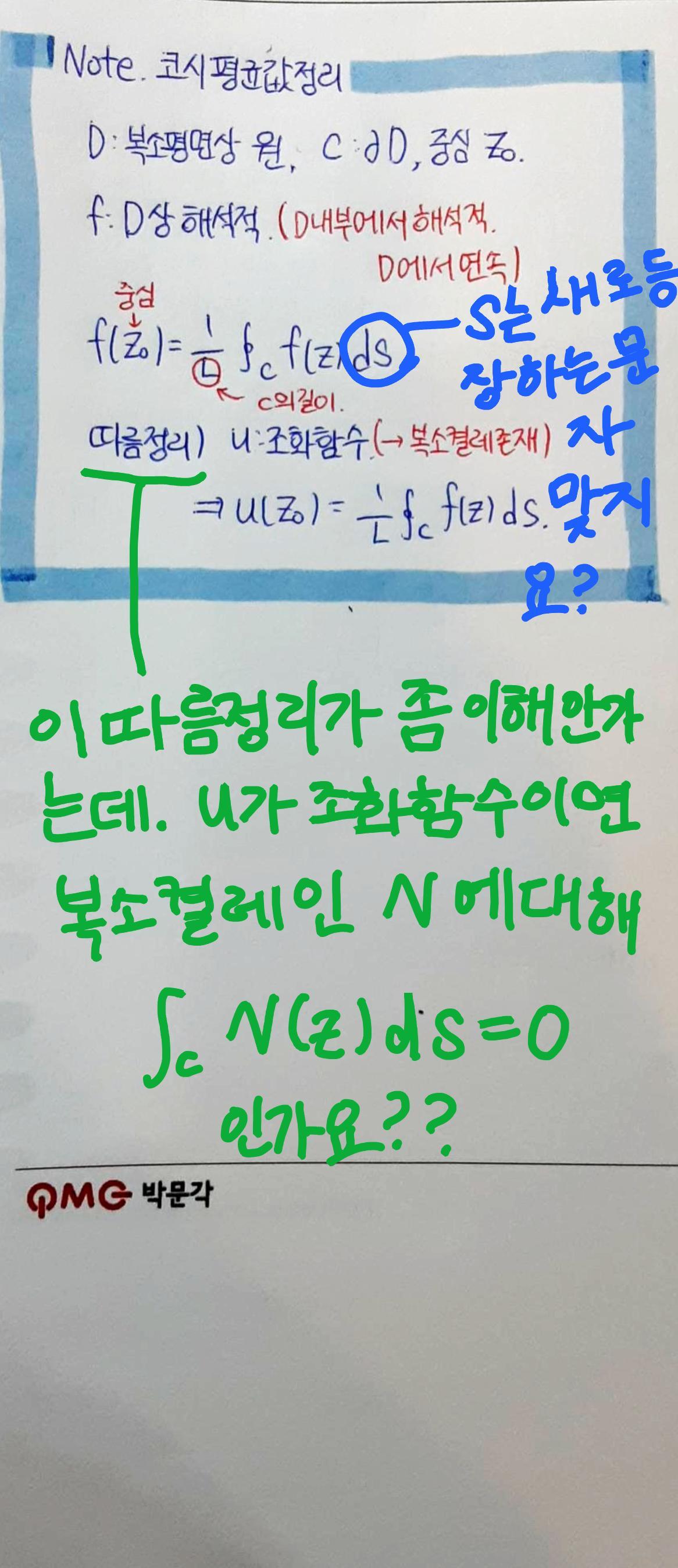 그런데 따름정리가 '조화함수u도 가우스평균값정리를 만족한다' 라는 의미라면 사진에 파란색으로 쓴 글씨를 이야기하는건가요?이미지 확대