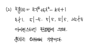 [현대 대수학]아이젠슈타인 판정법 작성자닉네임|작성시간20.09.17|조회수413 목록 댓글 2 글자크기 작게가 글자크기 크게가 교수님 사진과 같이 판정법을 소수로 나누는 계수를 거꾸로 사용가능한건가요??가능하다면 증명의 아이디어는 g(1/x)=h(x)로 보고 h에 대해 기약인것을 보이고 그로부터 g가 기약임을 보이는 아이디어인가요? 다음검색 현재 게시글 추가 기능 열기 북마크 공유하기 신고 센터로 신고 댓글 댓글 2 댓글쓰기 답글쓰기 댓글 리스트 작성자신선물고기 | 작성시간 20.09.17 비슷합니다만, h(x) = x^4g(1/x)로 놓고 보는 시각입니다. 답댓글 작성자닉네임 작성자 본인 여부 작성자 | 작성시간 20.09.17 아하 감사합니다~!! 댓글 전체보기