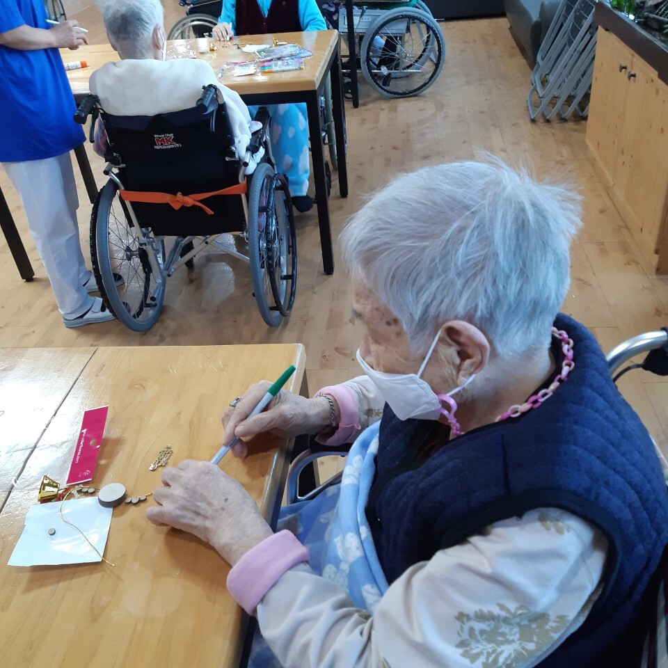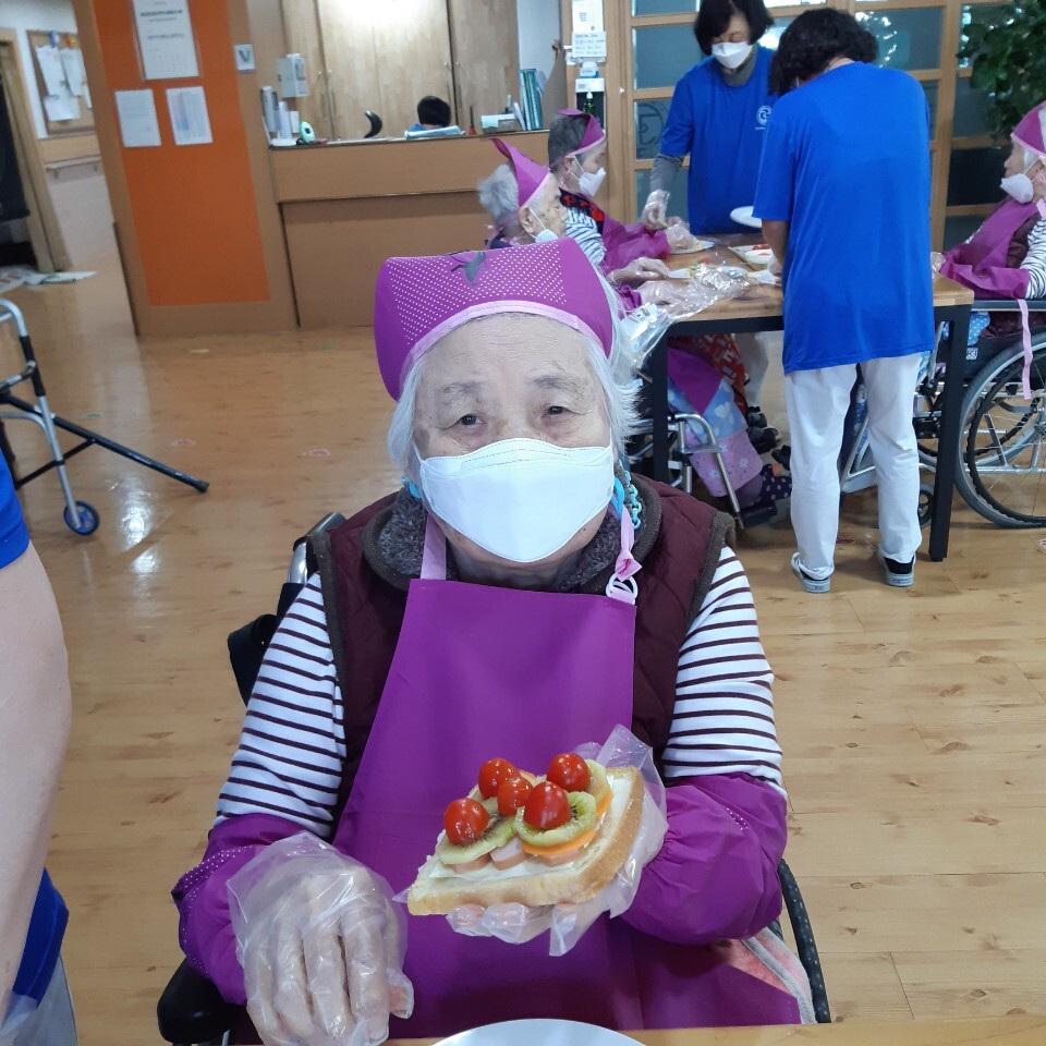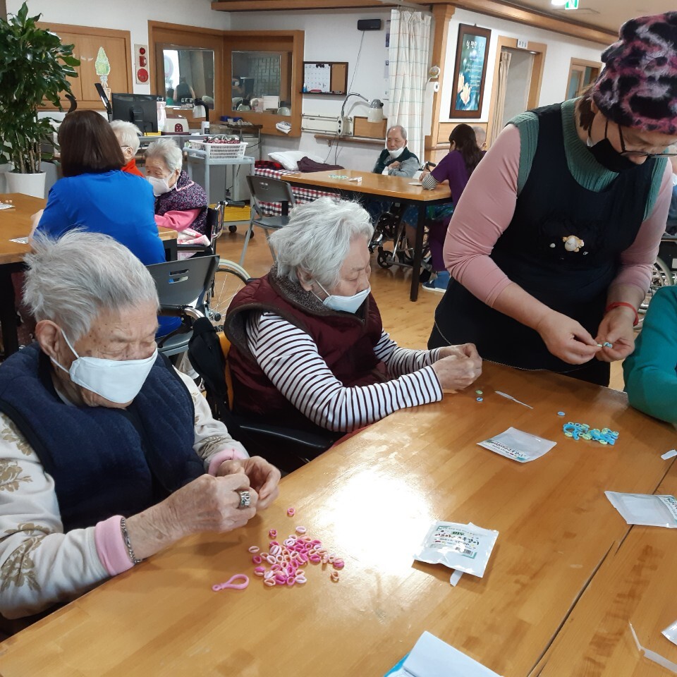 이번 주에는 맛사지 해드리기, 책읽어드리기, 작업활동-마스크 스트랩 만들기, 크리스마스 가랜드, 악세사리 만들기, 요리-카나페 만들기를 우리 어르신들과 함께 하였습니다. 특히 곧 다가올 크리스마스를 맞이해서 요리하기, 크리스 마스 악세사리를 직접 만들어 트리를 장식하며 기뻐하시는 모습에 저희들도 함께 행복한 시간이었답니다.^^