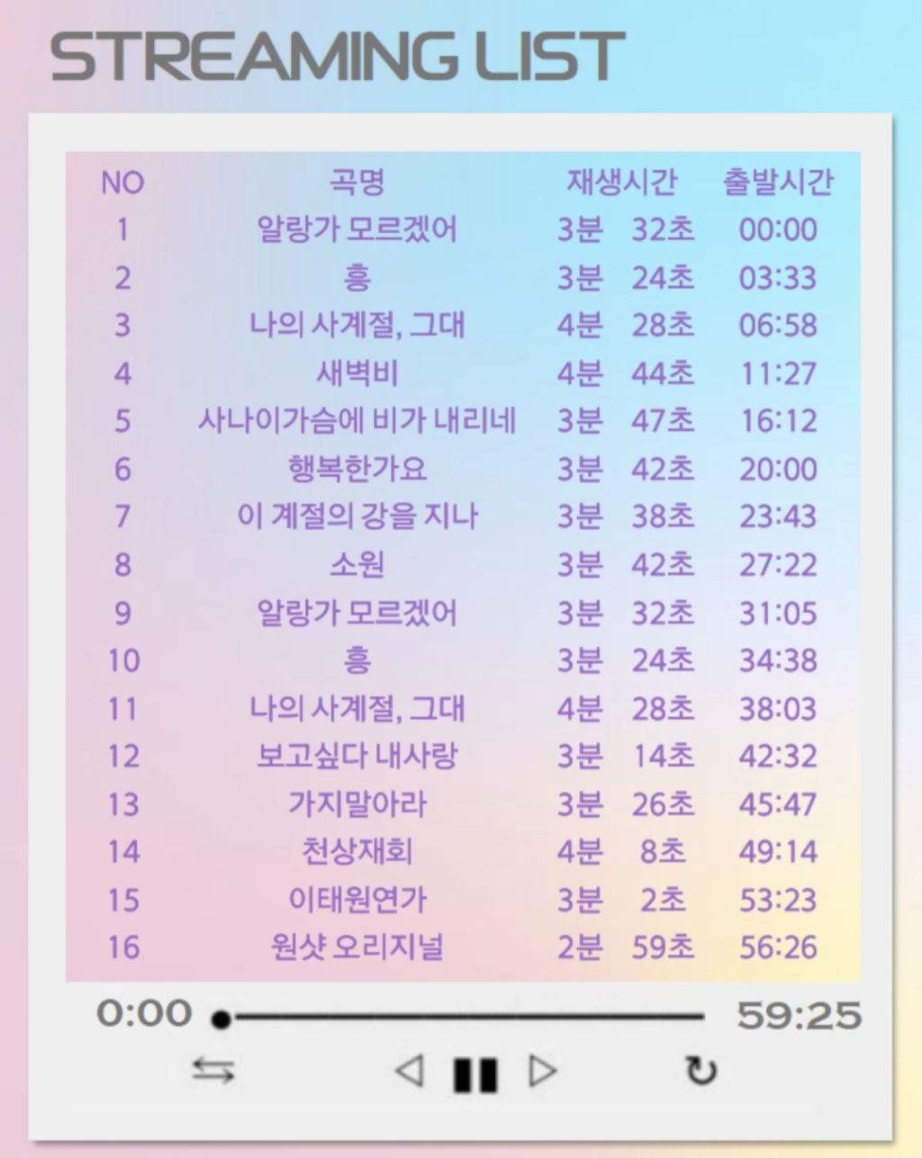 🎈<알랑가 모르겠어>, <흥>, <나의 사계절, 그대>를 2번씩 반영한 이유는 스밍이 끊길 사태를 대비함입니다.