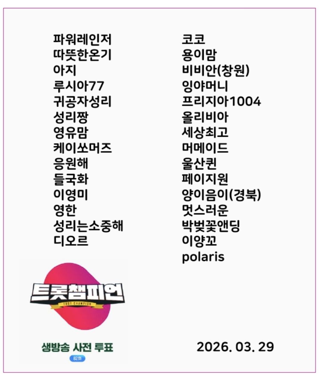 <트롯챔피언 82회 생방송 사전 투표> 5일차 입니다.