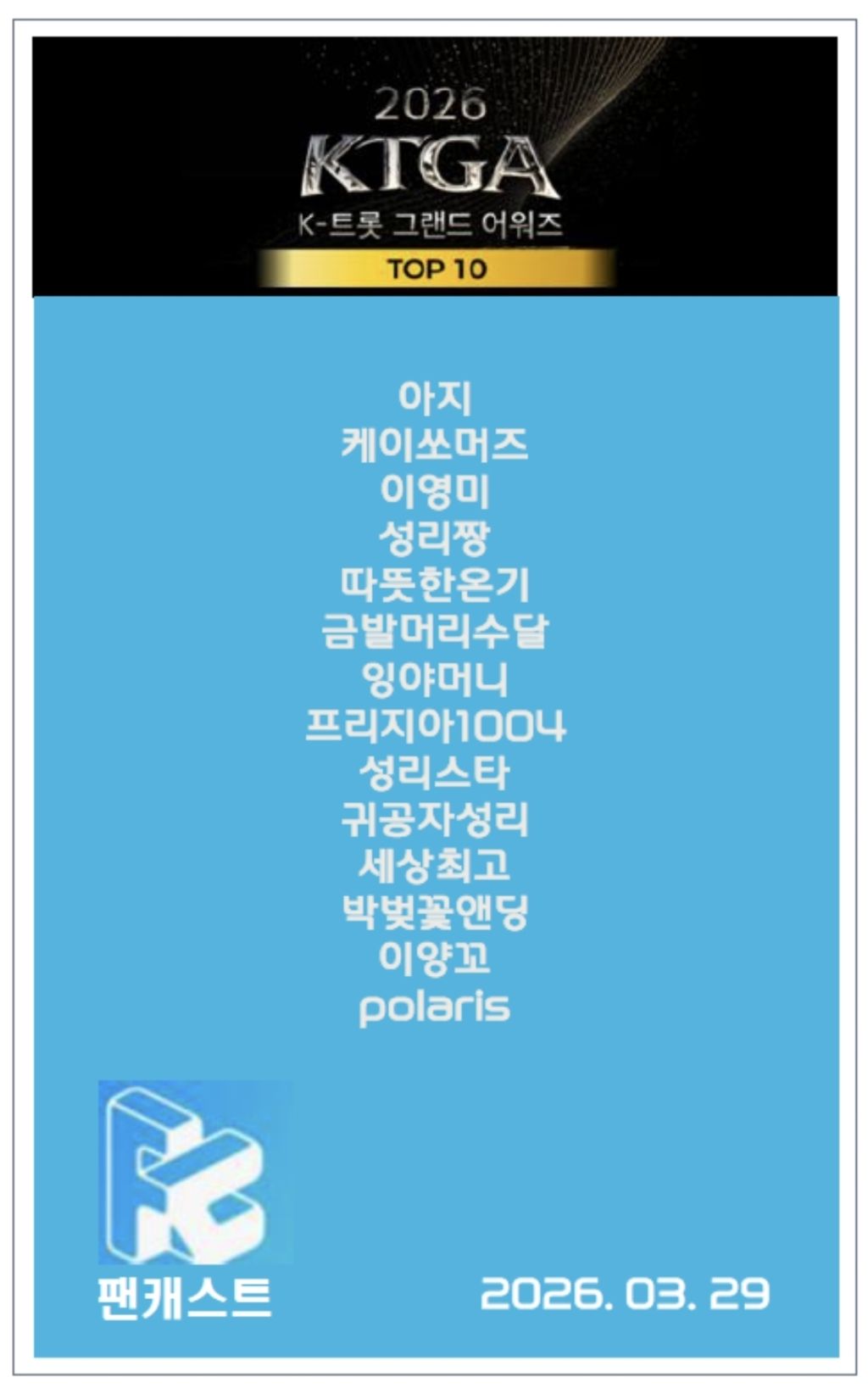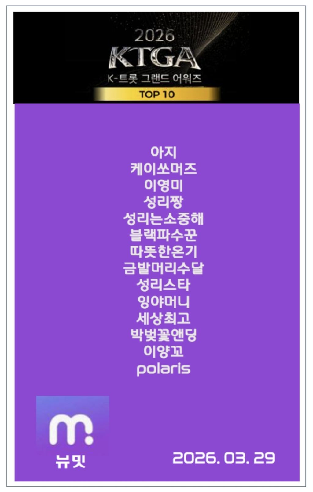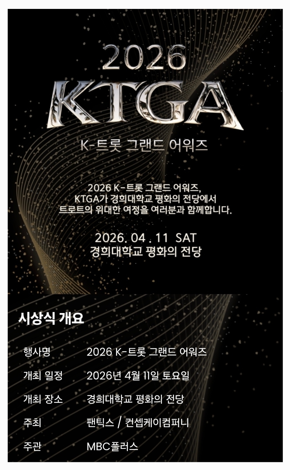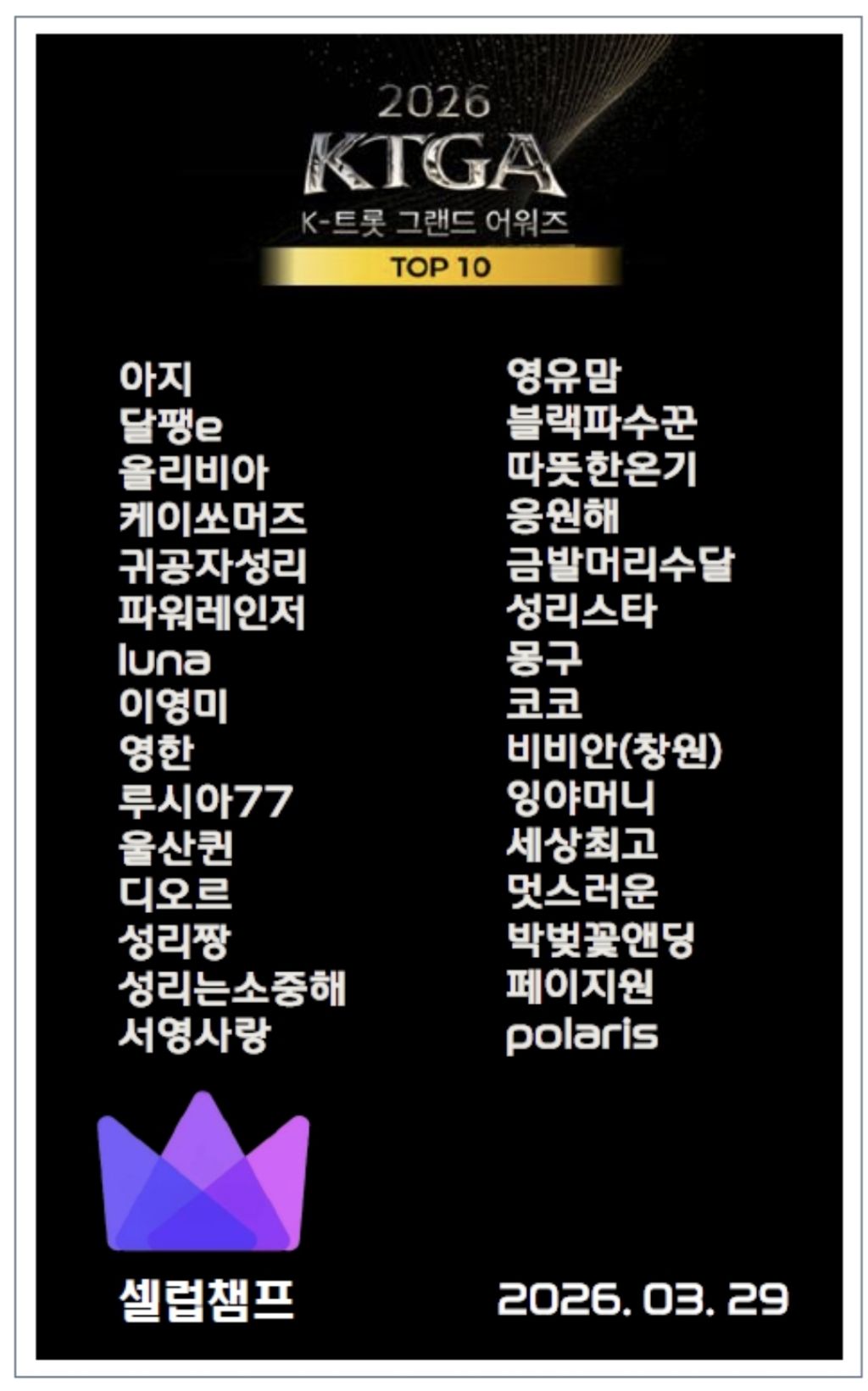 4월 11일(토) 경희대학교 평화의 전당에서 진행되는 2026 K-트롯 그랜드 어워즈에서 성리님이 수상자로 무대의 주인공으로 설 수 있도록 학자님들 오늘도 힘내 주세요~^^