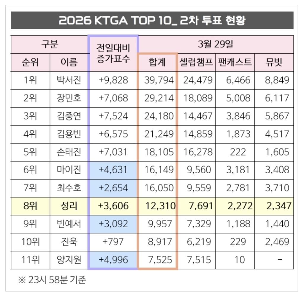 2026 KTGA TOP 10 2차 투표 5일차입니다.