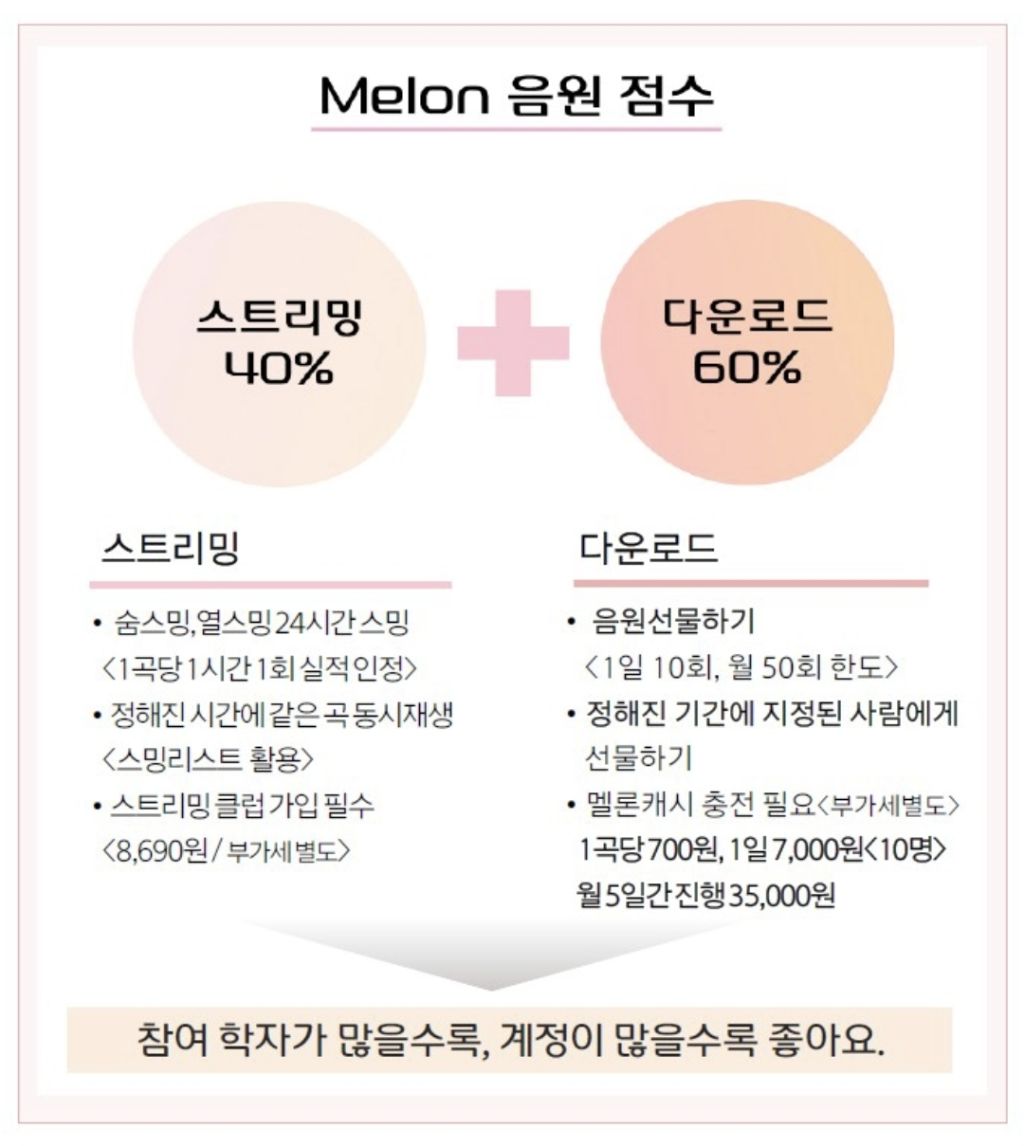 멜론 음원점수는 스트리밍과 다운로드 점수가 합산되며 선물하기는 다운로드 점수를 위해 참여합니다.