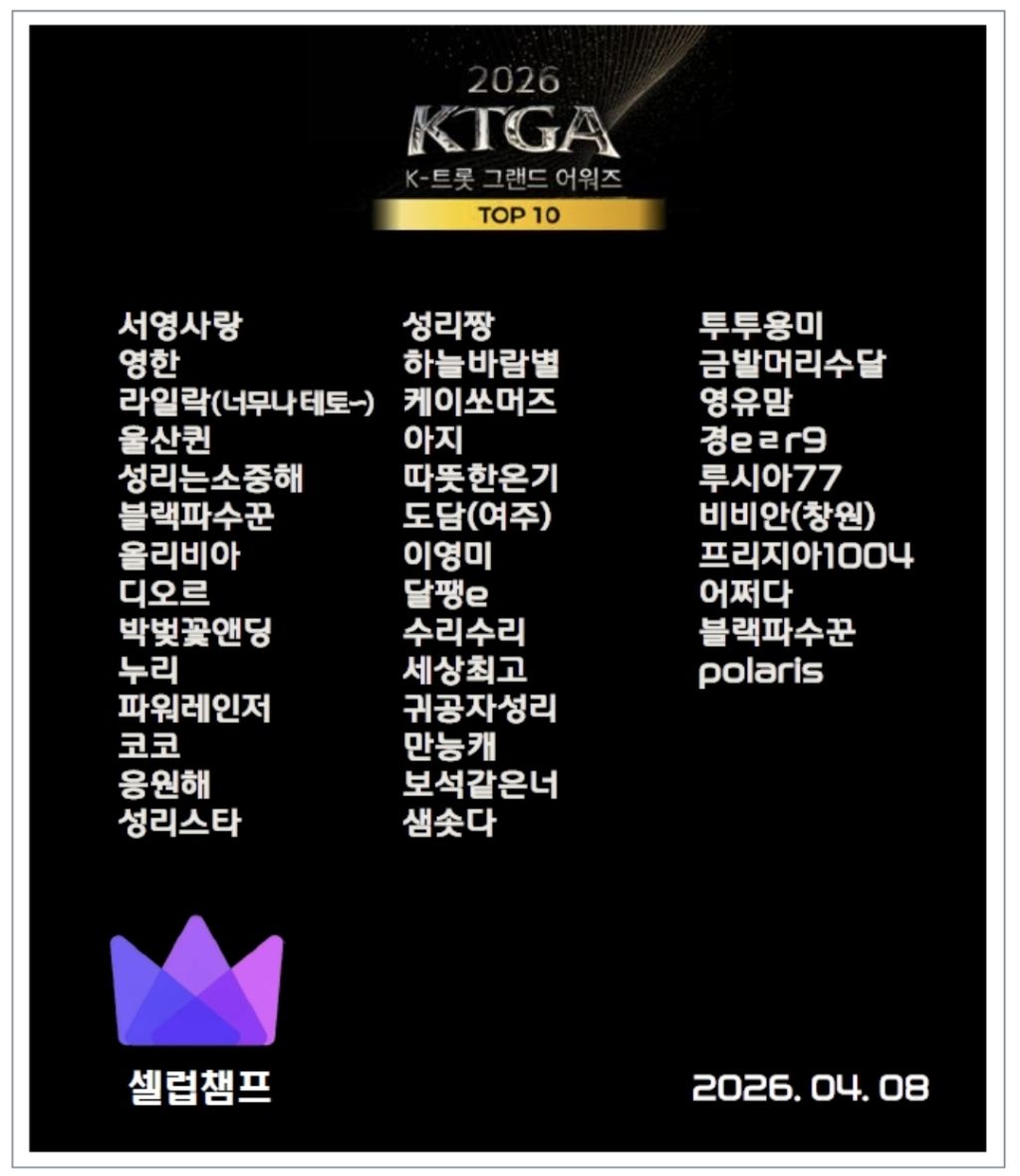<2026 K-트롯 그랜드 어워즈>에서 성리님이 수상자로 무대의 주인공으로 설 수 있도록 학자님들 오늘도 힘내 주세요~^^