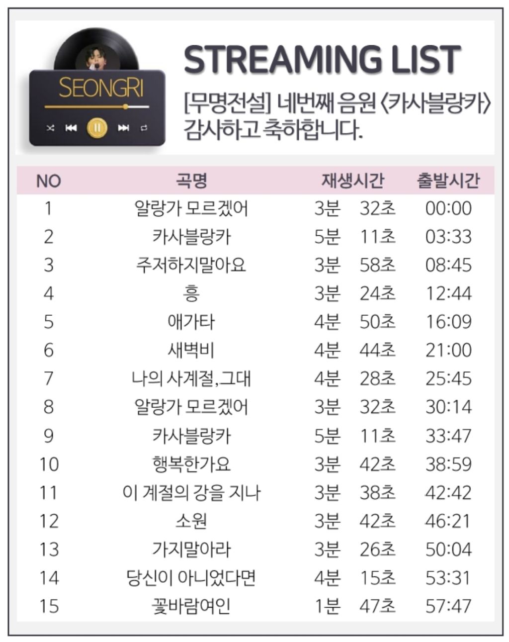 <카사블랑카> 음원서비스 재개에 맞추어 스밍리스트 업데이트 부탁드립니다.