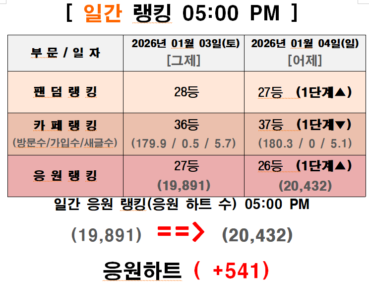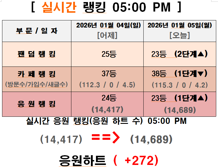 월요일마다 집계되며 한 주간의 총하트수💟로 순위가 매겨지는 주간응원랭킹 결과를 보여드리니 참고바랍니다.