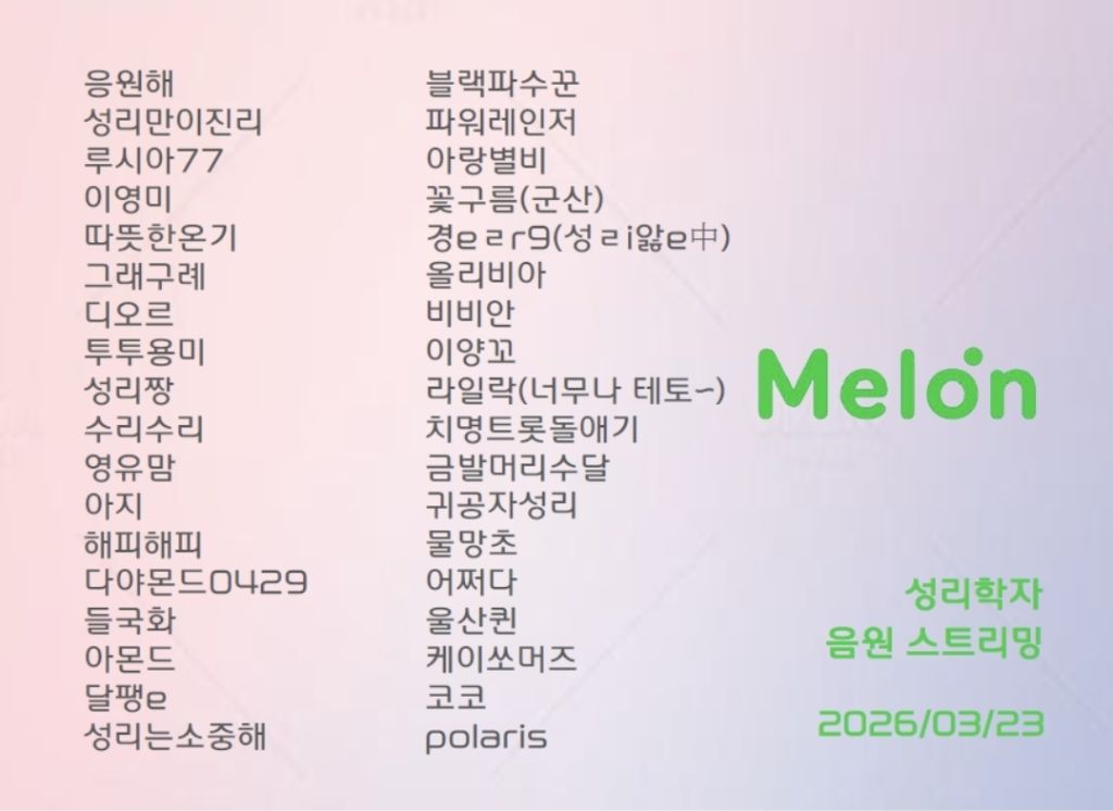 🥁 멜론 음원스밍에 새로이 함께 해 주신 학자님들 많이 반갑습니다^^