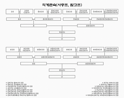 양계혈통에 따른 직계존속을 알기 위해서는 사증조, 팔고조를 알아야 한다. 사증조란 4분의 증조할아버지이며, 팔고조란 8분의 고조할아버지다. 부계와 모계를 따지면 고조 대에만 16분의 할아버지와 할머니가 있어야 한다.