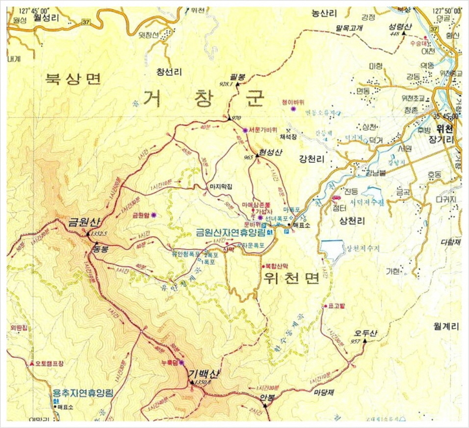 현성산은 1300미터 대인 기백산이나 금원산보다 훨씬 낮으나