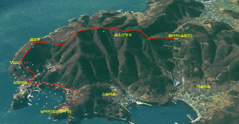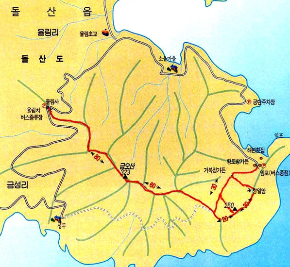 율림치정류장→ (1.2km)→ 금오산→ (0.9km)→ 삼거리→ (0.5km)→