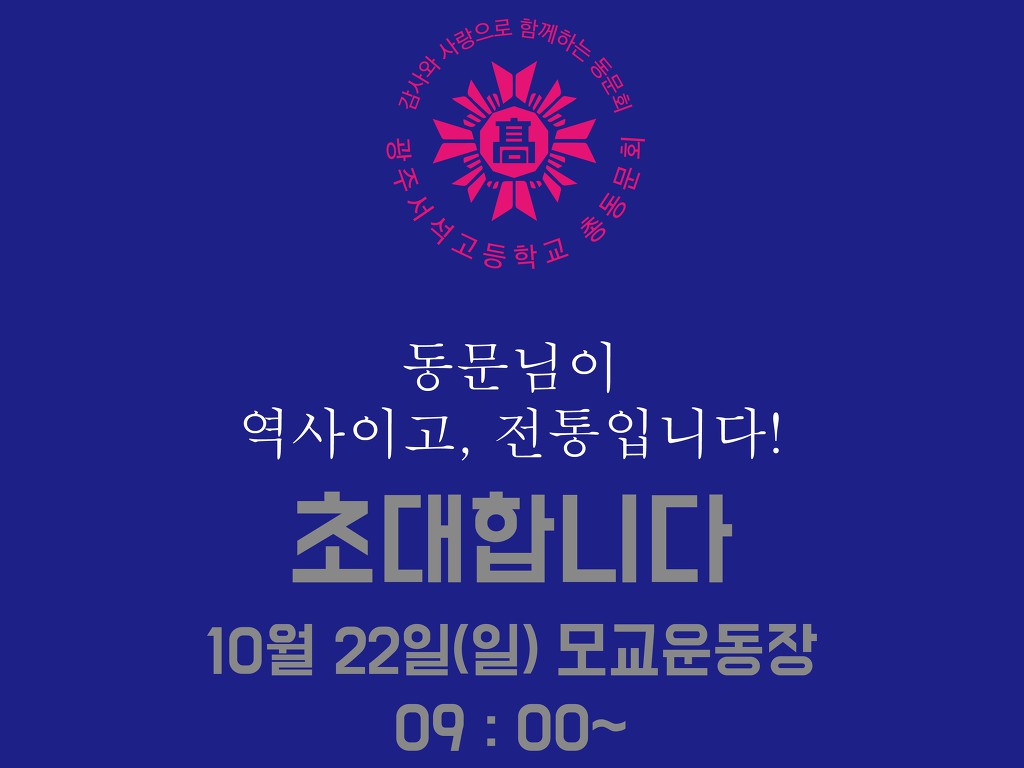 2017년 서석고 한마음 대축제 작성자양희재|작성시간17.10.08|조회수179 목록 댓글 3 글자크기 작게가 글자크기 크게가 서석고 총동문 체육대회를 2017년 10월22일 (일) 모교운동동장에서 개최하오니선배님 후배님 바쁘시더라도 꼭 참석하시어 대회를 빛내주시고 즐거운 하루를 보내시길 바랍니다. 다음검색 현재 게시글 추가 기능 열기 북마크 공유하기 신고 센터로 신고 댓글 댓글 3 댓글쓰기 답글쓰기 댓글 리스트 작성자김면수 | 작성시간 17.10.09 참석합니다. 감사합니다. 작성자오원집15회 | 작성시간 17.10.10 저두요!!! 작성자김석열 총동문 명예회장 | 작성시간 17.10.11 수고가 많습니다.모두들 감사합니다. 댓글 전체보기