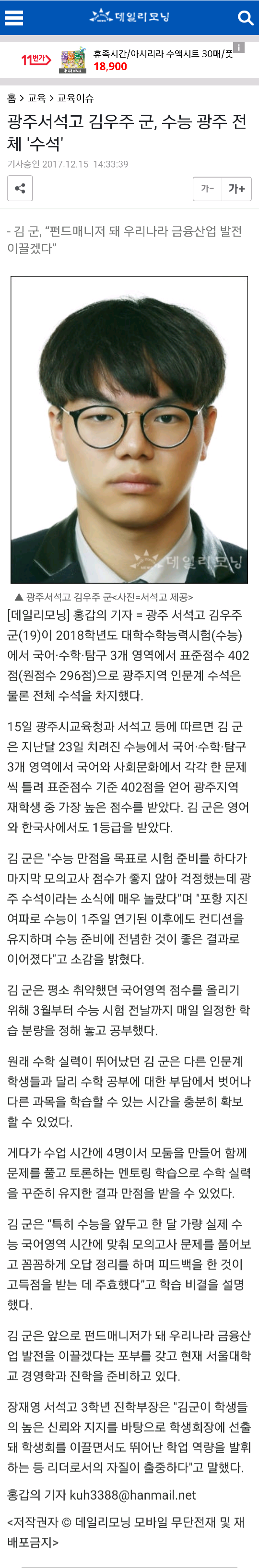 모교 김우주 재학생 2018년 대학수능력시험 광주지역전체수석 및 전국인문계수석 작성자양희재|작성시간17.12.14|조회수430 목록 댓글 1 글자크기 작게가 글자크기 크게가 다음검색 현재 게시글 추가 기능 열기 북마크 공유하기 신고 센터로 신고 댓글 댓글 1 댓글쓰기 답글쓰기 댓글 리스트 작성자김석열 총동문 명예회장 | 작성시간 17.12.15 우와~~축하축하.울,후배님들 기쁜소식을.....감사합니다 댓글 전체보기
