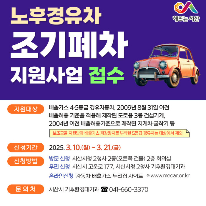 서산시가 청정한 대기환경을 조성하기 위해 올해 상반기 노후차량 조기폐차 지원사업 신청자를 접수한다.