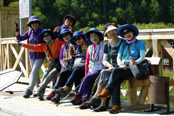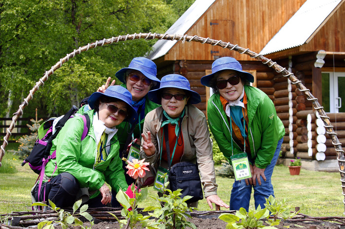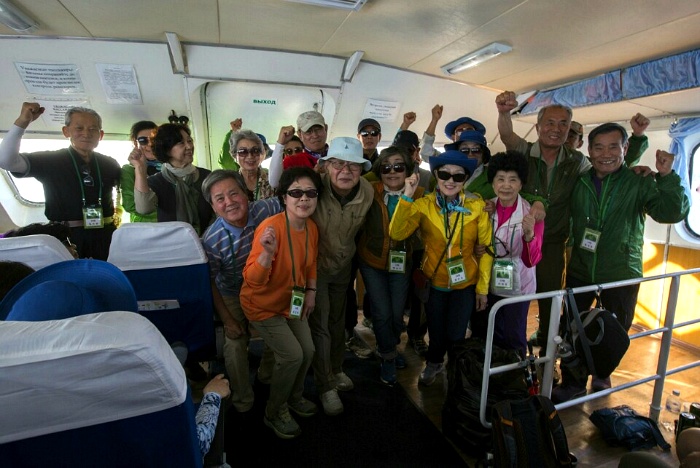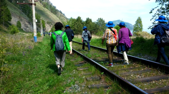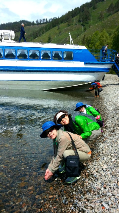 다시 배를 타고 점심 먹으러 감. 점심먹으러 가는 길 한참 숲길을 걸어 자작나무 숲 속 저~쪽에 식당이 보인다. 식당은 정원을 예쁘게 꾸며 놓았다. 식사는 조촐한 러시아 가정식 한끼 식사. 샐러드, 비트스프, 흑빵, 닭고기스튜를 끼얹은 밥, 홍차 (아직 밥이 안 나온 상태에서 찍었음) 이 곳에서는 어느 식당에서건 식사시 늘 홍자가 나온다. 생수는 돈 내야 주지만 뜨거운 홍차는 달라는 대로 얼마든지 갖다 준다. 여기서 사진 촬영 많이 하고... 참가 전원이 다 찍히진 않았지만... 좌측부터 이창흥, 이순민(이병규),정수웅, 이건우, 이수영, 김인숙, 김복환, 권혜자, 오영환, 신호영, 장영철, 최명상, 김승기, 황대현, 채현기 자외선이 강해 선글라스를 꼭 끼라고 해서 거의 다 끼어 얼굴구분이 잘 안 될겁니다. (단체가 다 모이기가 쉽지 않아 앞으로 또 단체사진 나올 때에 이름을 쓰겠습니다.) 박온화 후배가 이 포토죤에 들어가 보라고 주문해서... (그러고 보니 파란 모자 쓴 사람 끼리만 찍었네 ...좌측부터; 신호영, 권혜자, 김인숙, 엄숙자) 오후~~ 환바이칼 열차 구간 중간에 위치한 빨라빈나 역 에서부터 철길따라 슈미하 역까지 8K 구간 (2시간 정도) 트레킹. 마침 우리의 출발점인 이 역에 열차가 들어왔다. 환바이칼 관광 열차다. 내일 산에 안 가는 우리 팀들도 이 열차를 타게 될거다. 역에서 몇분씩 정차했다가 떠난다. 우리는 이 열차가 출발하기 전에 빨리 앞에 있는 터널을 지나가야 한다. 오른쪽은 바이칼호수, 왼쪽은 산이다 햇볕은 뜨겁지만 습하지 않아 그늘에 들어가면 시원하다. 길가에 들꽃들이 지천. 다리위의 외국인들은 열차에서 내려 산책중인 사람들. 열차가 기적을 울리면 다시 열차로 돌아가 타고 떠난다. 정차했던 그 열차가 출발해서 다가 왔다. 다 지나갈 때까지 기다렸다가 다시 걷는다. 칠흑같은 터널구간 통과하기. 터널 중간쯤에 가면 아무것도 안 보인다. 물론 스마트 폰으로 불을 밝히고 간 사람도 있지만 밧데리가 다 닳아 버릴까봐 앞사람 신발 뒤축만 따라 멀리 출구를 향해 묵묵히 진행. 도중 만난 간이역에서 잠시 후배들과 쉬고... 우측 끝이 박온화 후배. 사진, 춤, 레크레이션,등 여러가지 재능으로 활약이 크다. 이번엔 총동회관에 라인댄스강좌를 개설한다고 다들 오라고 한다. 종착지 슈미하에 도착. 호숫물에 지친 발을 담가 피로를 푼다. 선두그룹에 따라 와야 좀 쉴 여유도 있지 쳐져서 오면 쉬지도 못하고 그냥 바로 배를타고 떠나야 한다. 침목사이가 보폭과 맞지 않아 걷기에 불편해서 좀 불만들을 토로 하고 내일도 이러냐고 물었는데 회장이 내일은 절대 이렇지 않고 낮은 구릉이고 숲이고 가기에 부담이 없을꺼라고 안심시킴. 돌아 오는 배 안에서 박온화 후배가 레크레이션을 진행했고 우리 14회가 졸업 55주년 기념으로 최다인원 참가했다고 전원 다 불려 나가