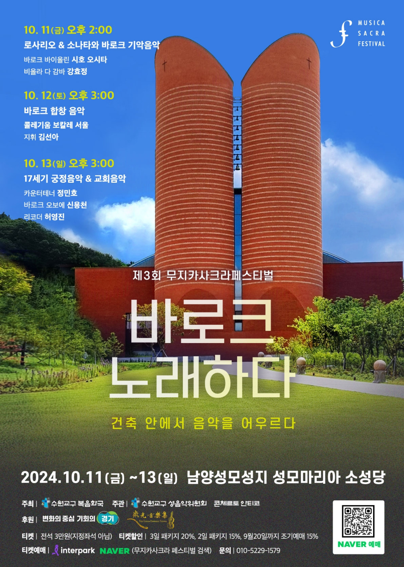 제3회 무지카사크라 페스티벌은 바로크음악중에서도 성음악을 중심으로 3일간 경기도 남양성모성지에서 열리게 됩니다. 남양성모성지는 우리나에서 가장 큰 성모성지이며 이상각 신부님께서 30년동안 애정을 가지고 수원교구 신자들과 함께 일궈온 성지입니다. 세계적인 건축가 마리오보타가 설계를 하였으며 수원교구 주보성인인 평화의 모후를 모티브로 하여 빛을 이용하는 건축가 마리오보타가 그 뜻을 잘 받아들여 아름다운 성전을 탄생시켰습니다.