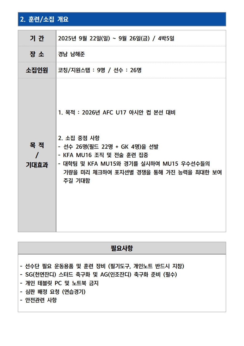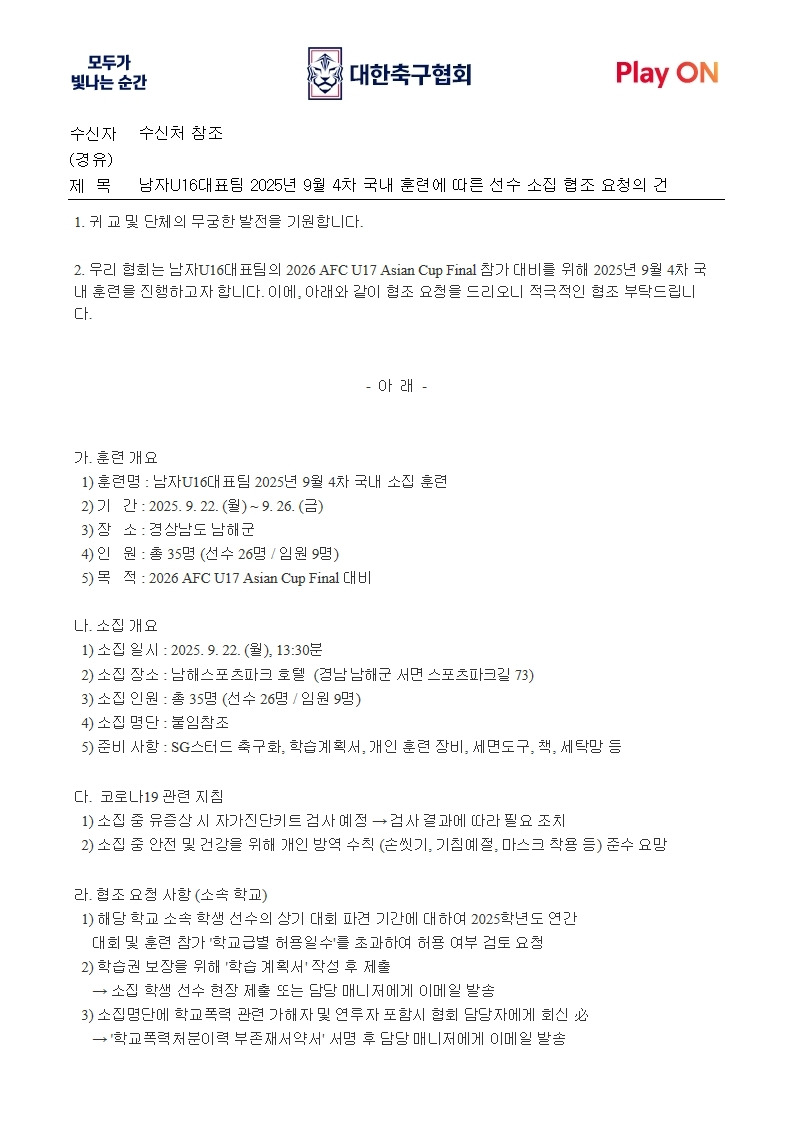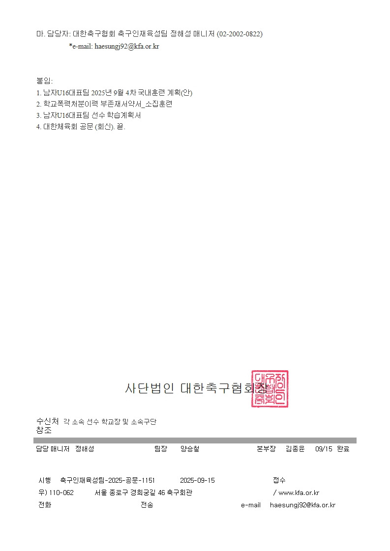 [스크랩] 남자U16대표팀 2025년 9월 4차 국내훈련 소집 명단(9월22일~26일=남해스포츠파크) 작성자홍석민수석코치|작성시간25.09.16|조회수67 목록 댓글 1 글자크기 작게가 글자크기 크게가 다음검색 스크랩 원문 : 풋볼뉴스(Football News) 현재 게시글 추가 기능 열기 북마크 공유하기 신고 센터로 신고 댓글 댓글 1 댓글쓰기 답글쓰기 댓글 리스트 작성자홍석민수석코치 작성자 본인 여부 작성자 | 작성시간 25.09.16 대동초축구부 졸업생 권영웅 화이팅! 댓글 전체보기