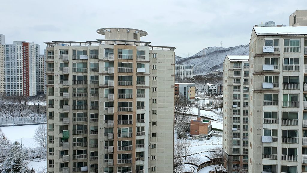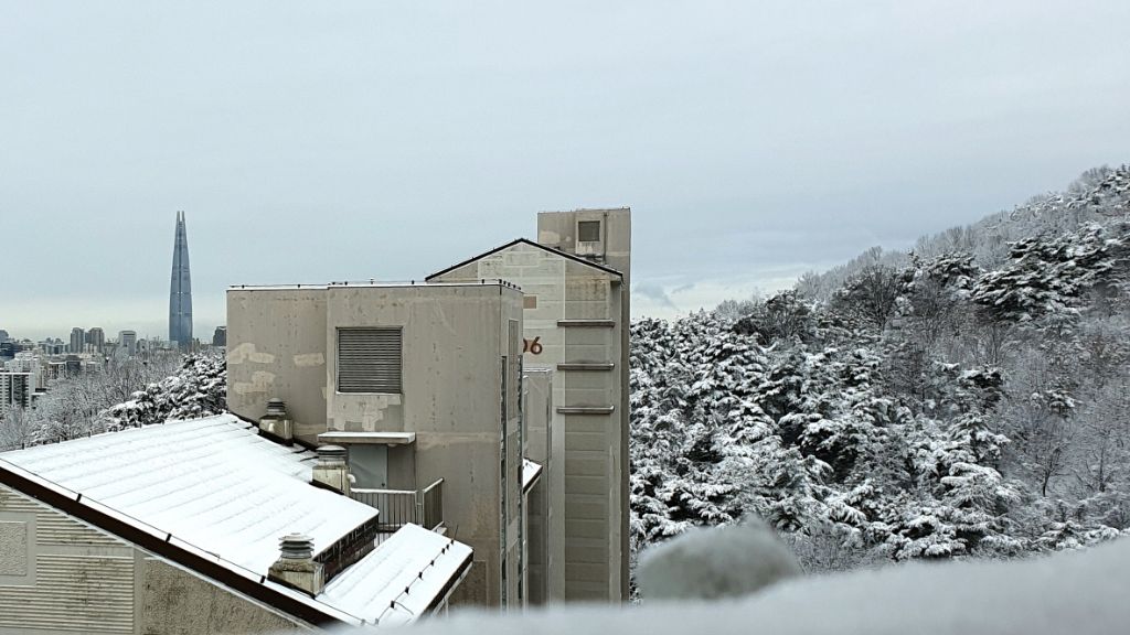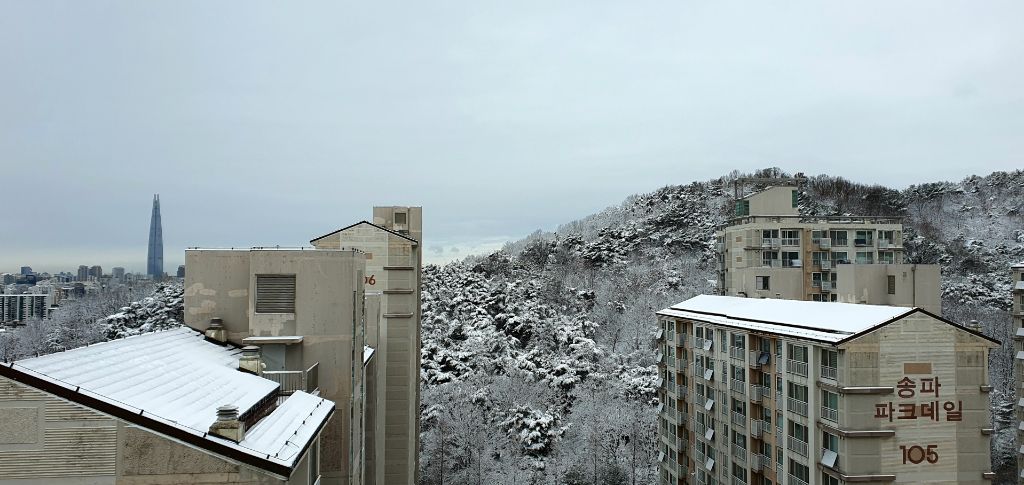 울 아파트 창밖 앞과 뒤를 온통 흰색으로 칠해놓은 수묵화 닮은 오늘 아침 마천동 설경..
