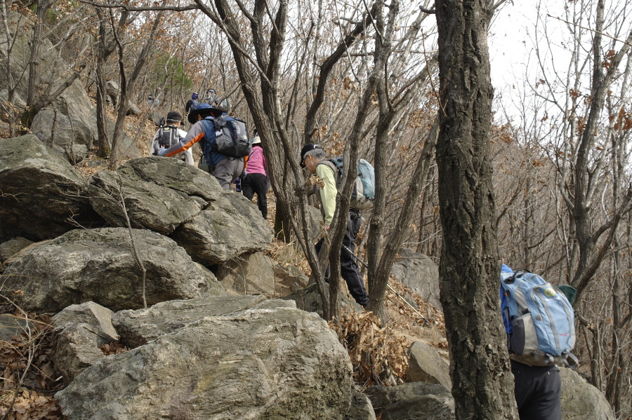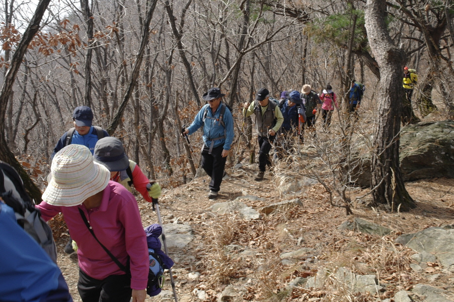곧 이어 준수의 가이드에 따라 산행을 개시했는 데, 고의성이 다분하게? 원래 1차 목표인 예봉산을 조금 지난 철문봉으로 직접 오르는 길입니다. 덕분에 경사도가 어지간합니다만 낙엽이 잔뜩 깔린 조용한 오솔길을 오르게 되었읍니다. 19명이 되니 거진 2개 분대, 중간에 다른 팀들이 섞이지 않아도 무척이나 긴 대열입니다.