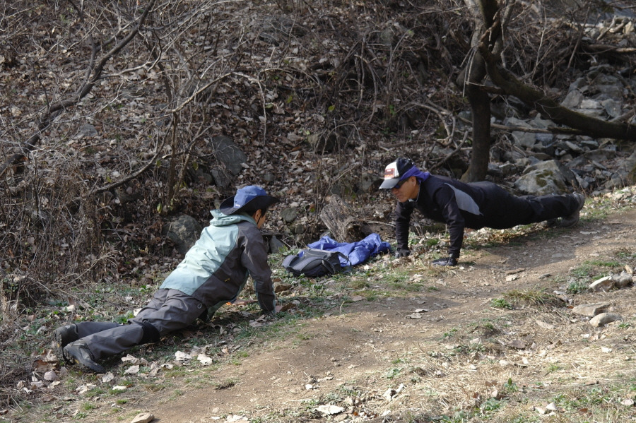 웬 마님 앞에서 머슴들의 힘자랑??? 산행 거리가 짧음을 무언중 시위하는 중이랍니다. 운길산으로 돌아 내려 오라고 하니 장어가 눈에 어른거려 발을 떼지 못합니다......