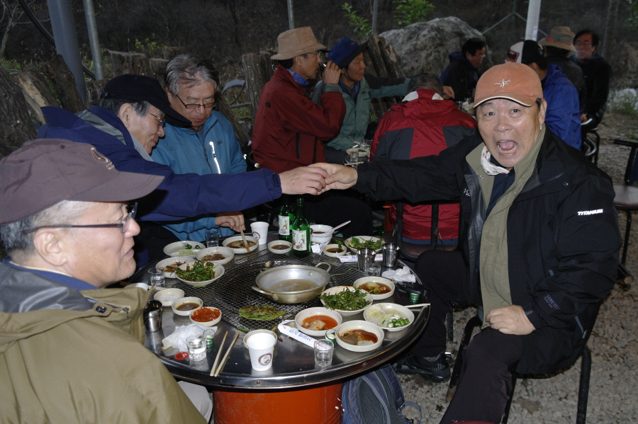 전철을 한대 놓쳐 뒤늦게 운길산역에서 식당차를 타고 올라온 마지막 주자인 양 정수 부부(16:10)입니다. 덕분에 더욱 많은 환영의 박수를 받았답니다. 현재는 다리가 아파 산에 참석은 못하지만 규정에도 없는 년회비를 억지로 받게하는 등, 우리 모임에 항상 관심이 많은 입산회의 고참입니다.