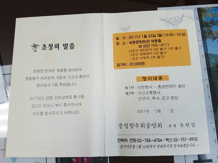 충청향우회중앙회 신년회 작성자안재정|작성시간17.01.17|조회수124 목록 댓글 2 글자크기 작게가 글자크기 크게가 . 다음검색 현재 게시글 추가 기능 열기 북마크 공유하기 신고 센터로 신고 댓글 댓글 2 댓글쓰기 답글쓰기 댓글 리스트 작성자정 용 석(珍古介)카페지기 | 작성시간 17.01.21 감사 합니다. 작성자임한철 | 작성시간 17.01.25 참고로 공지사항, 말씀 드려요!~~ 본 행사는 충청 향우회 변동으로 번잡함 피해서, 2017년 1월 23알 행사는 취소 되고, 2017년 2월15일 (수요일) 충청 향우회 정기 총회겸 신년 하례회를 같이 하기로 결정 되었으니, 바쁘시지만 많은 참석 부탁 드려요!~~ 향우회 상임 고문, 임 한 철 배상!~~~ 댓글 전체보기