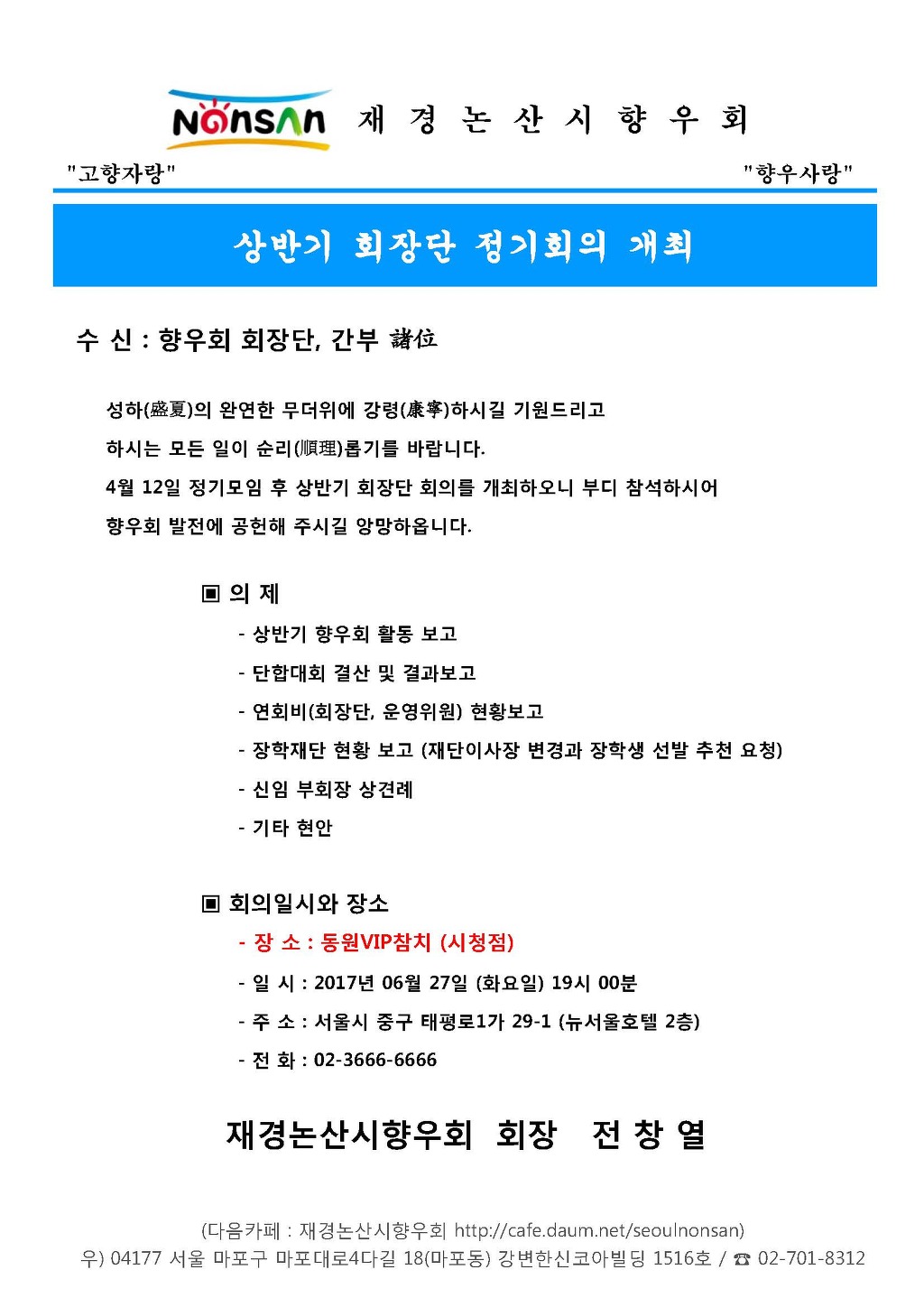 회장단 6월 정기모임 안내 작성자안재정|작성시간17.06.21|조회수73 목록 댓글 2 글자크기 작게가 글자크기 크게가 다음검색 현재 게시글 추가 기능 열기 북마크 공유하기 신고 센터로 신고 댓글 댓글 2 댓글쓰기 답글쓰기 댓글 리스트 작성자임한철 | 작성시간 17.06.22 날로 발전 하는 활기찬, 향우회 모습에 찬사 보냅니다!~~ 전 창 열 회장님!~정점으로 !~~~한 마음, 한 뜻으로, 일치 단결 화합되는 모습 참 아름답고 , 타 향우회에 귀감이 됩니다!~~~~우리 서로 이해와 관용 베푸는 겸양 지덕 정신으로 웃음 꽃 피는, 모범 향우회 되어요!~~~ 덕산 시인 배상!~~~ 작성자정 용 석(珍古介)카페지기 | 작성시간 17.06.23 지대한 관심과 사랑 감사 드림니다. 댓글 전체보기