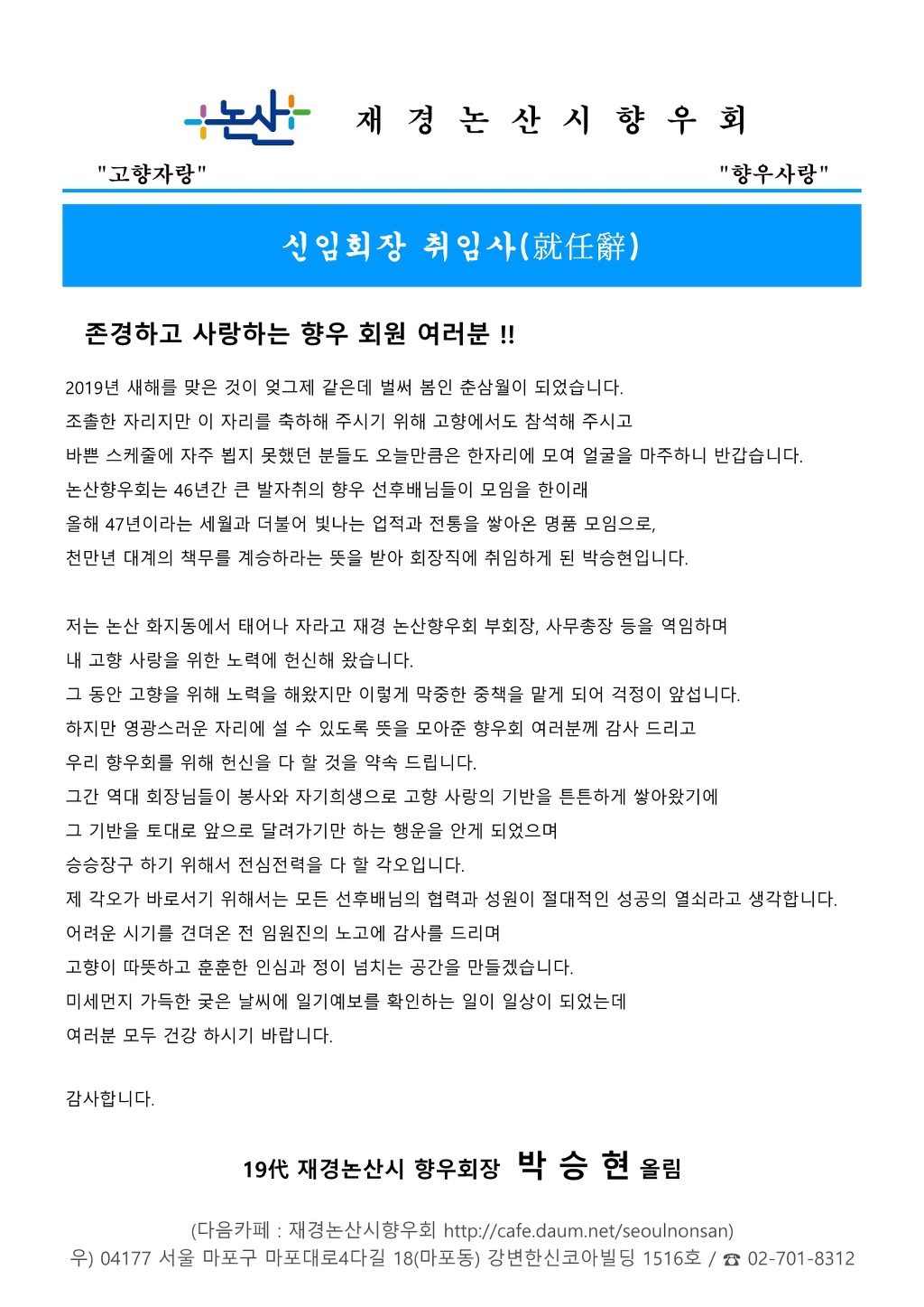 제19代 향우회 신임회장 就任辭 작성자사무직원 전소영|작성시간19.07.16|조회수317 목록 댓글 0 글자크기 작게가 글자크기 크게가 다음검색 현재 게시글 추가 기능 열기 북마크 공유하기 신고 센터로 신고 댓글 댓글 0 댓글쓰기 답글쓰기 댓글 리스트