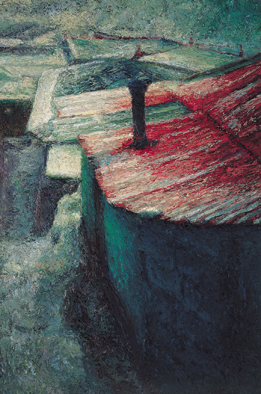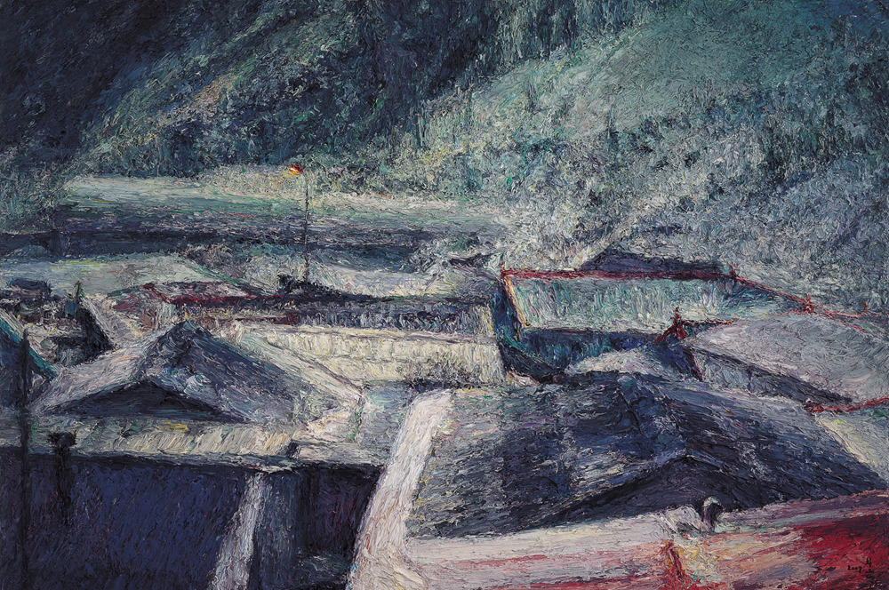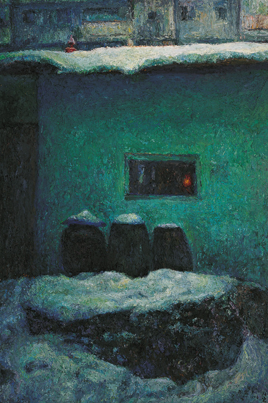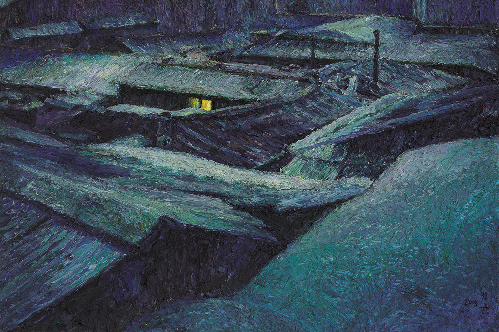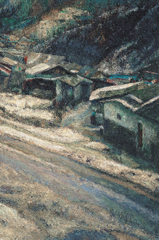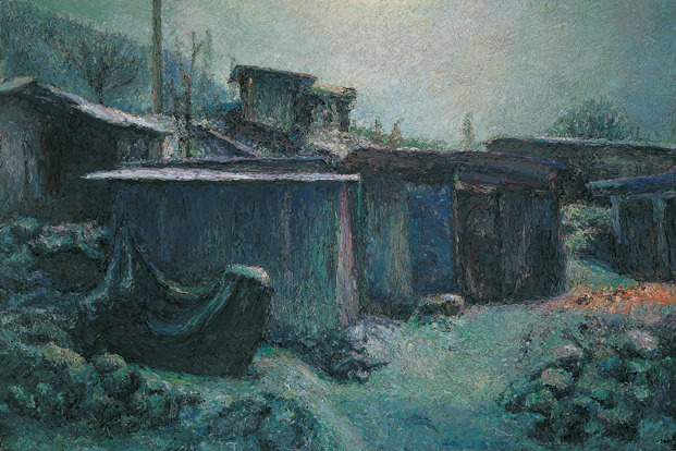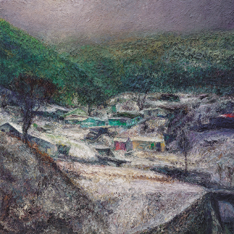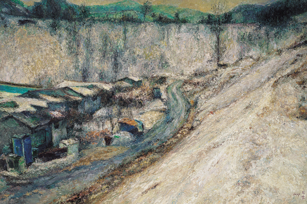 화가 오치균은 손가락으로 물감을 섞고 찍어서 화면에 투덕투덕 바른다. 그의 그림은 독특하다. 색상은 검은 색이거나 청동색 계열로 칙칙하다. 그리는 대상은 퇴락한 탄광 마을의 집들이나 누추한 골목이다. 그 곳의 한 단면을 뚝 잘라서 보여준다.