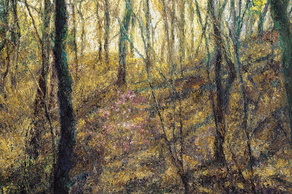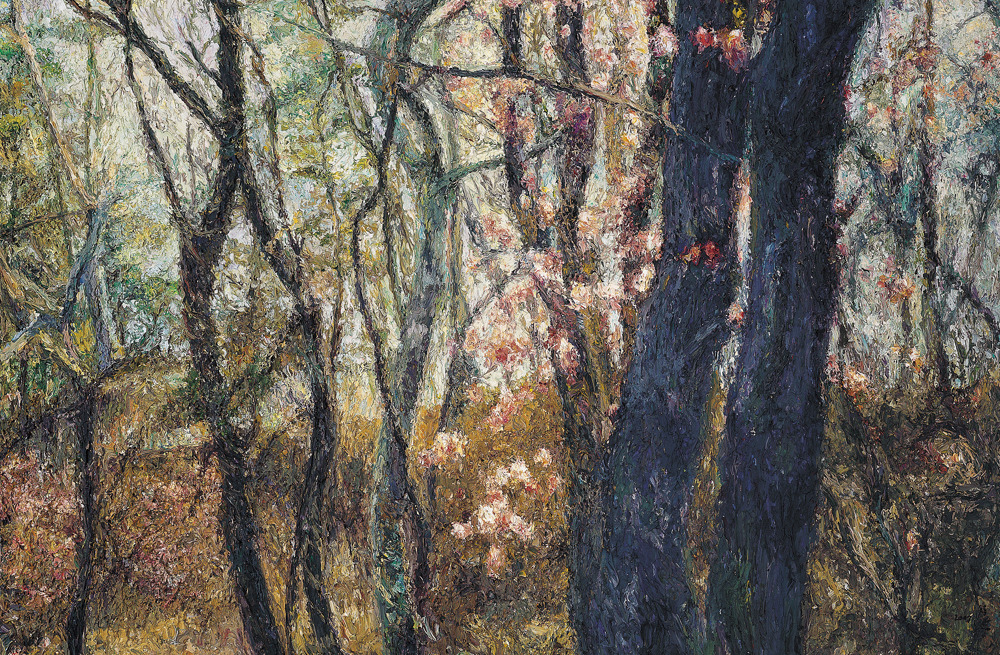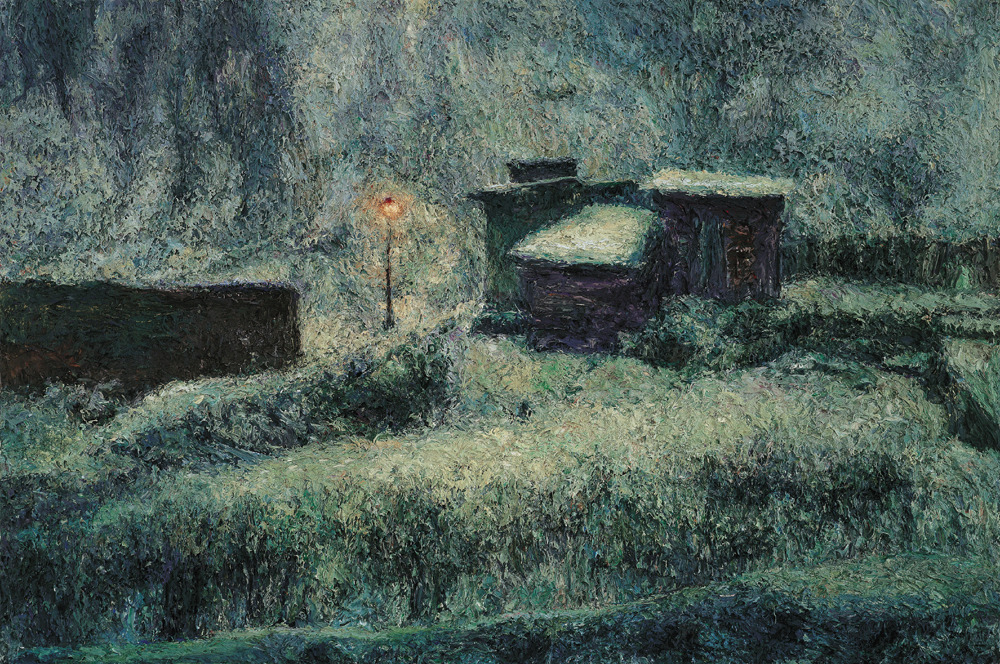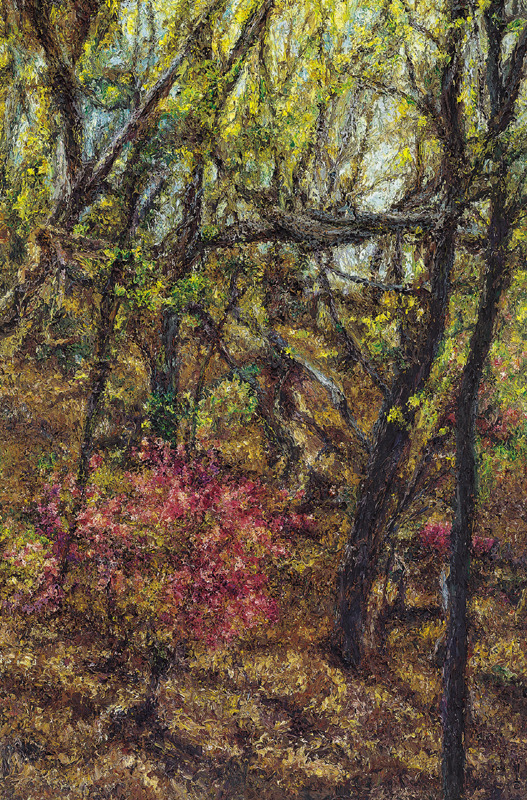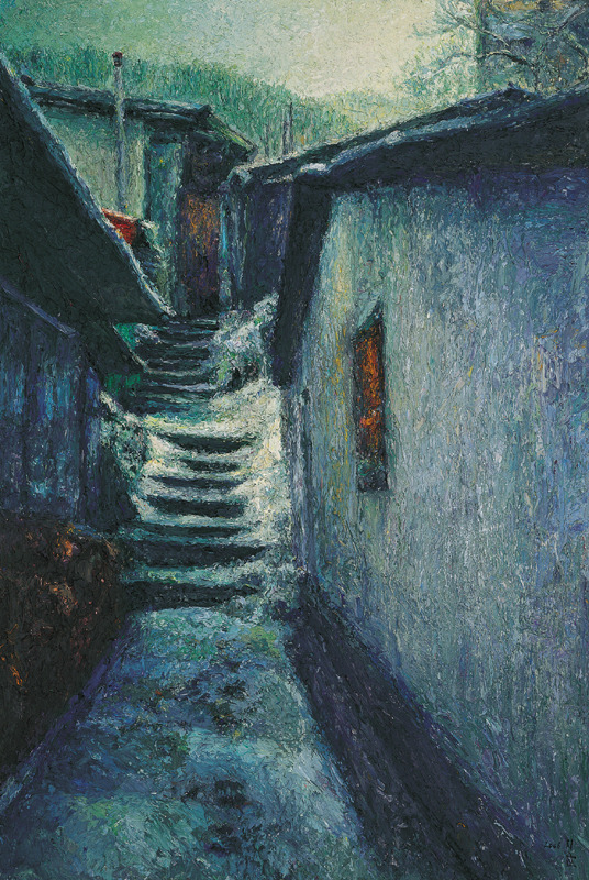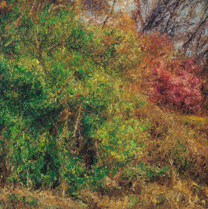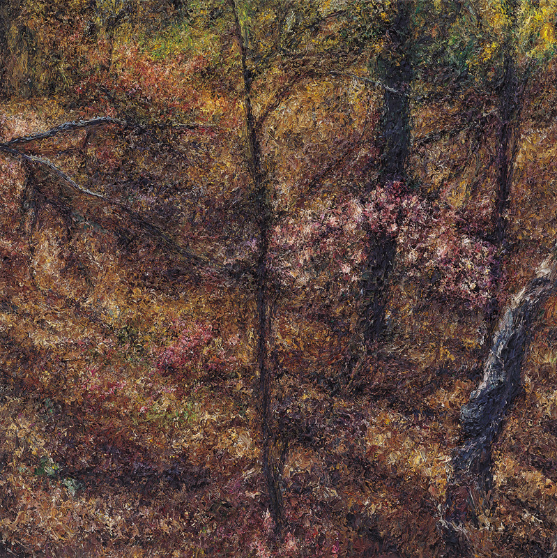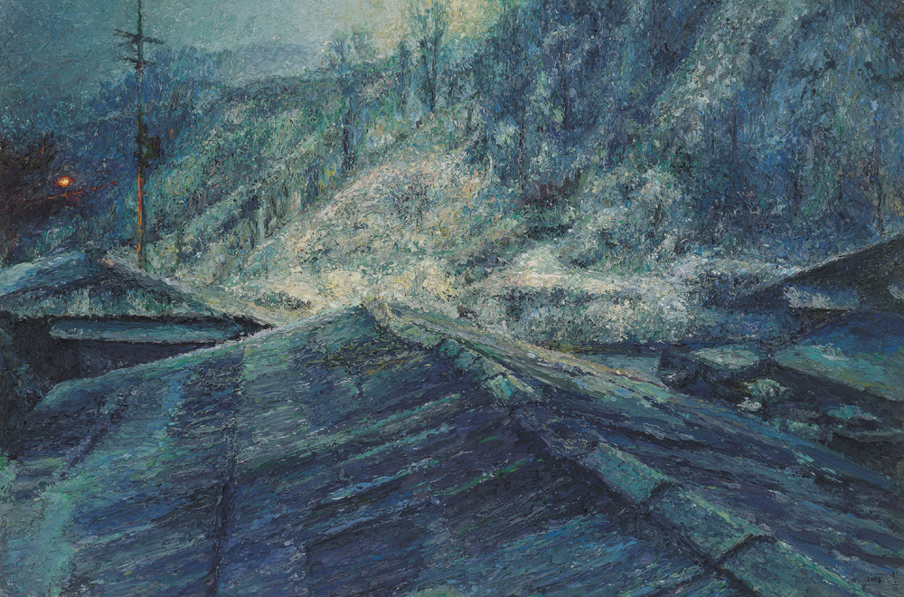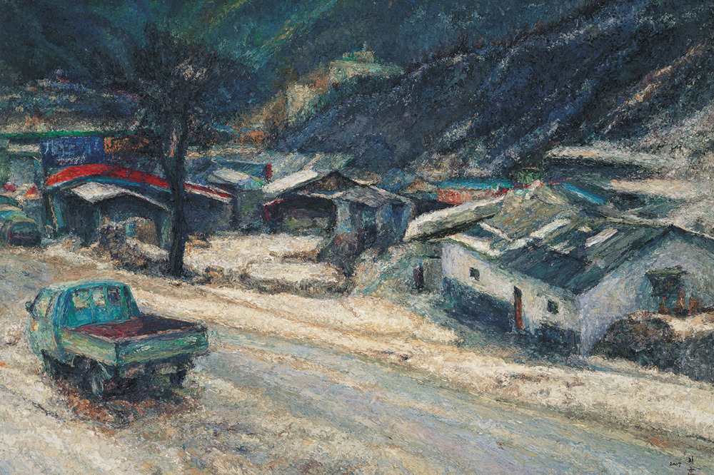 직접적인 형태가 제시되는 것도 아니다. 가까이서 보면 수없이 덧바른 물감 자국만 있을 뿐이다. 형태는 일정한 거리를 두고 보아야 비로소 드러난다. 흐릿하던 형태들이 점차 뚜렷한 현장감과 존재감을 가지고 화면에서 일어선다. 현장감은 그림의 시선에서 온다. 외부에서 바라보는 것이 아니라 현장에서 대상을 직접 들여다보고 있는 시각과 구도다. 존재감은 물감을 중첩함으로써 형태를 연상케하는 기법에서 온다.