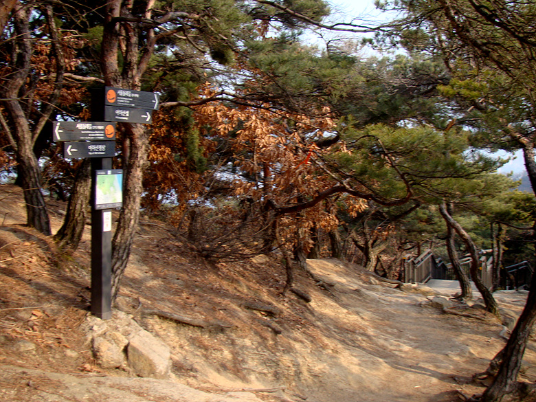 포기하고 아차산을 마주하며 긴고랑 갈림길을 지나 계단을 따라올라