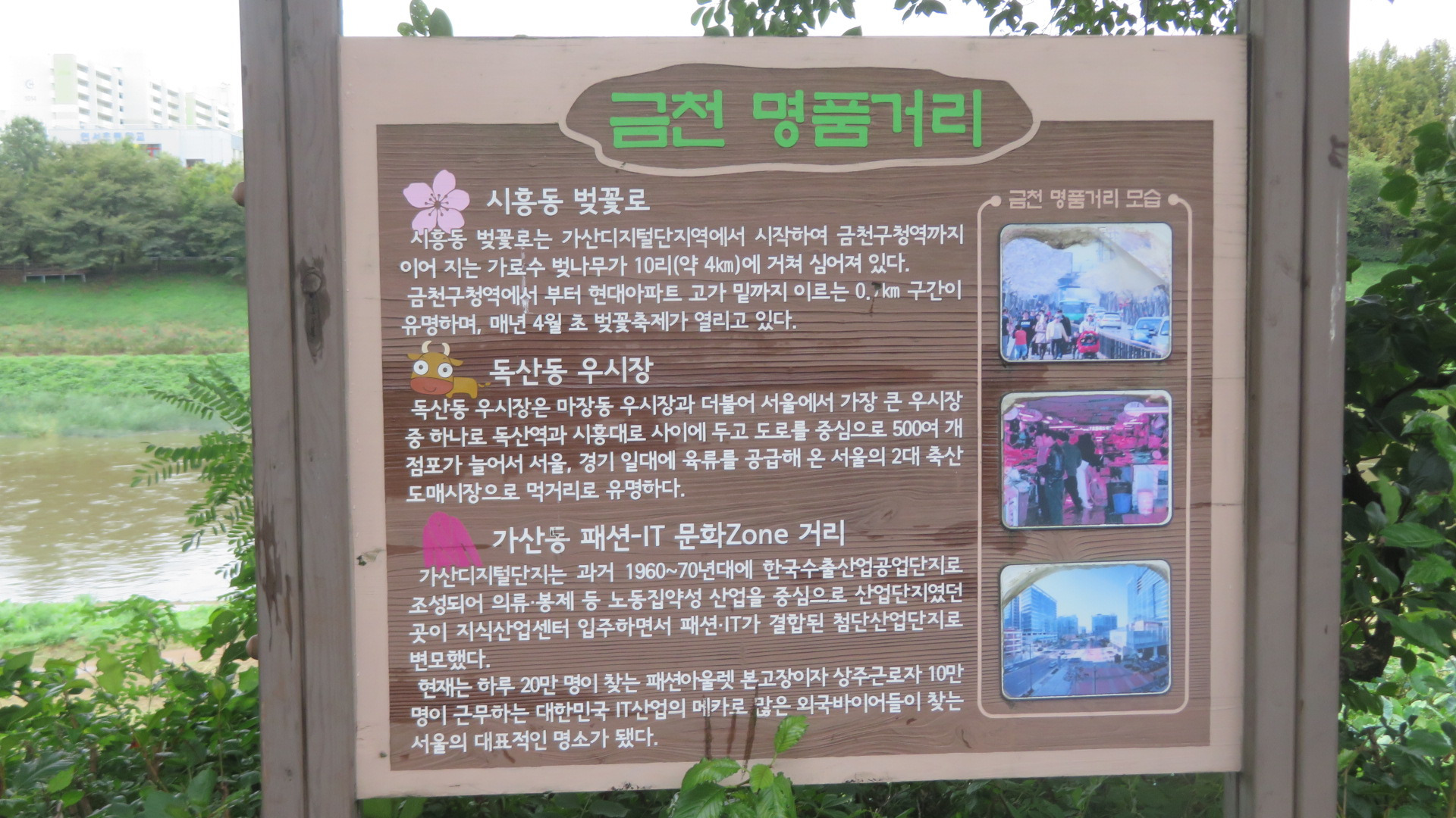 서울둘레길 13코스 안양천 상류 코스는 안양천 벚나무길로 접어든다. 안양천 제방을 따라 길게 이어지는 안양천 벚나무길은 서울에서 가장 긴 벚나무길로, 봄철이면 길게 조성된 제방로를 따라 심어진 아름드리 벚나무들 사이를 여유롭게 산책하면서 벚꽃을 감상할 수 있는 곳으로 손꼽히는 서울 벚꽃 명소이다. 금천구 벚나무길은 3.4km 거리에 이르는 벚꽃 십리길로 벚꽃 축제의 명소이기도 하다.