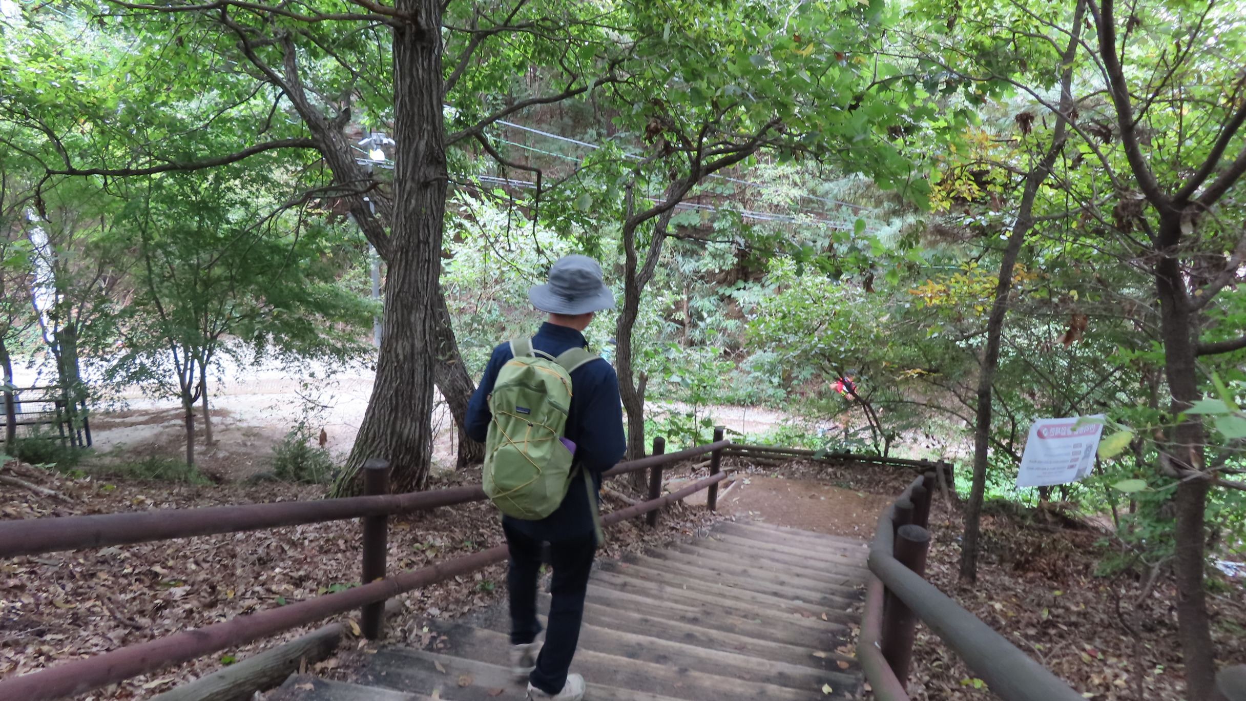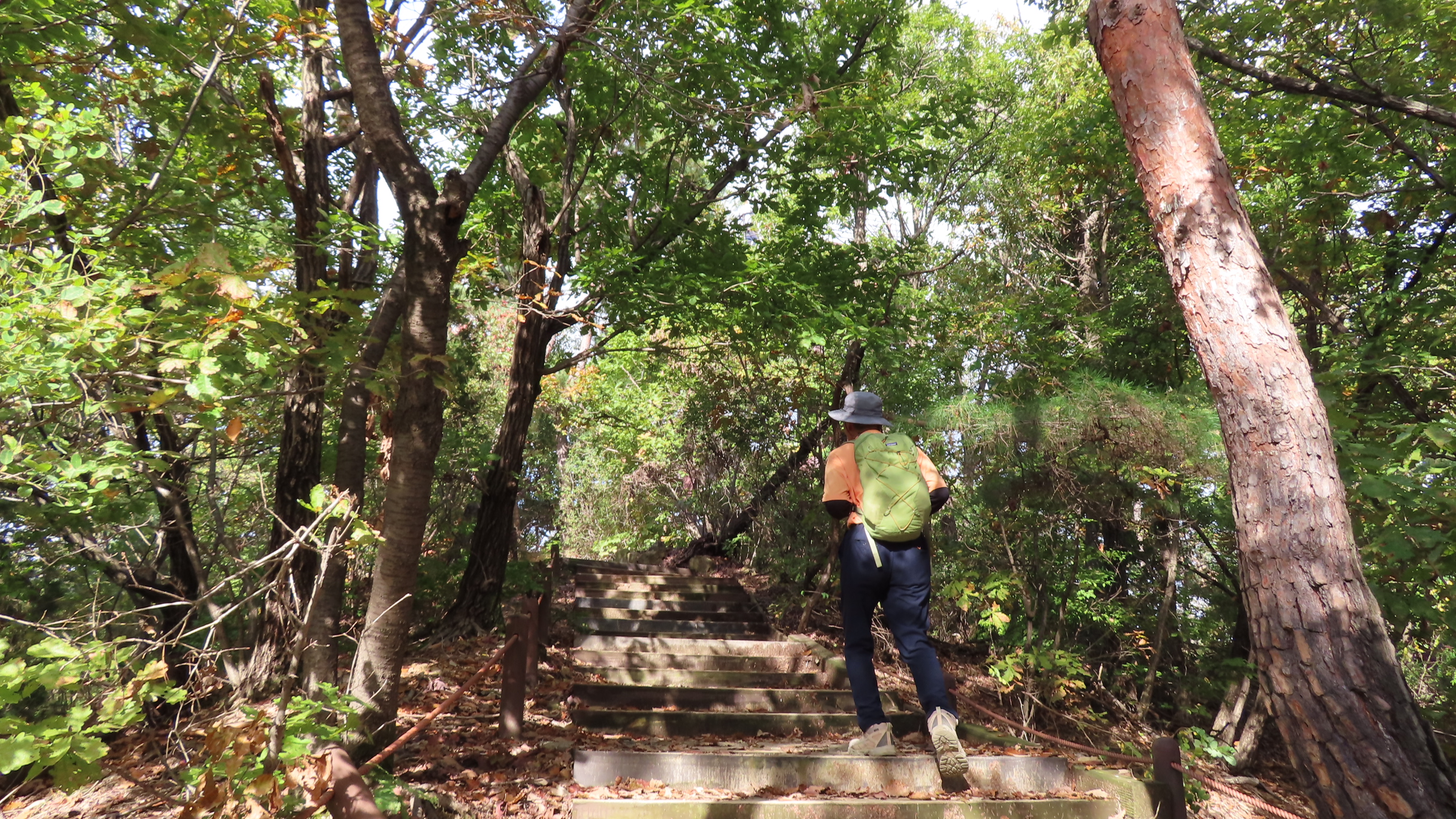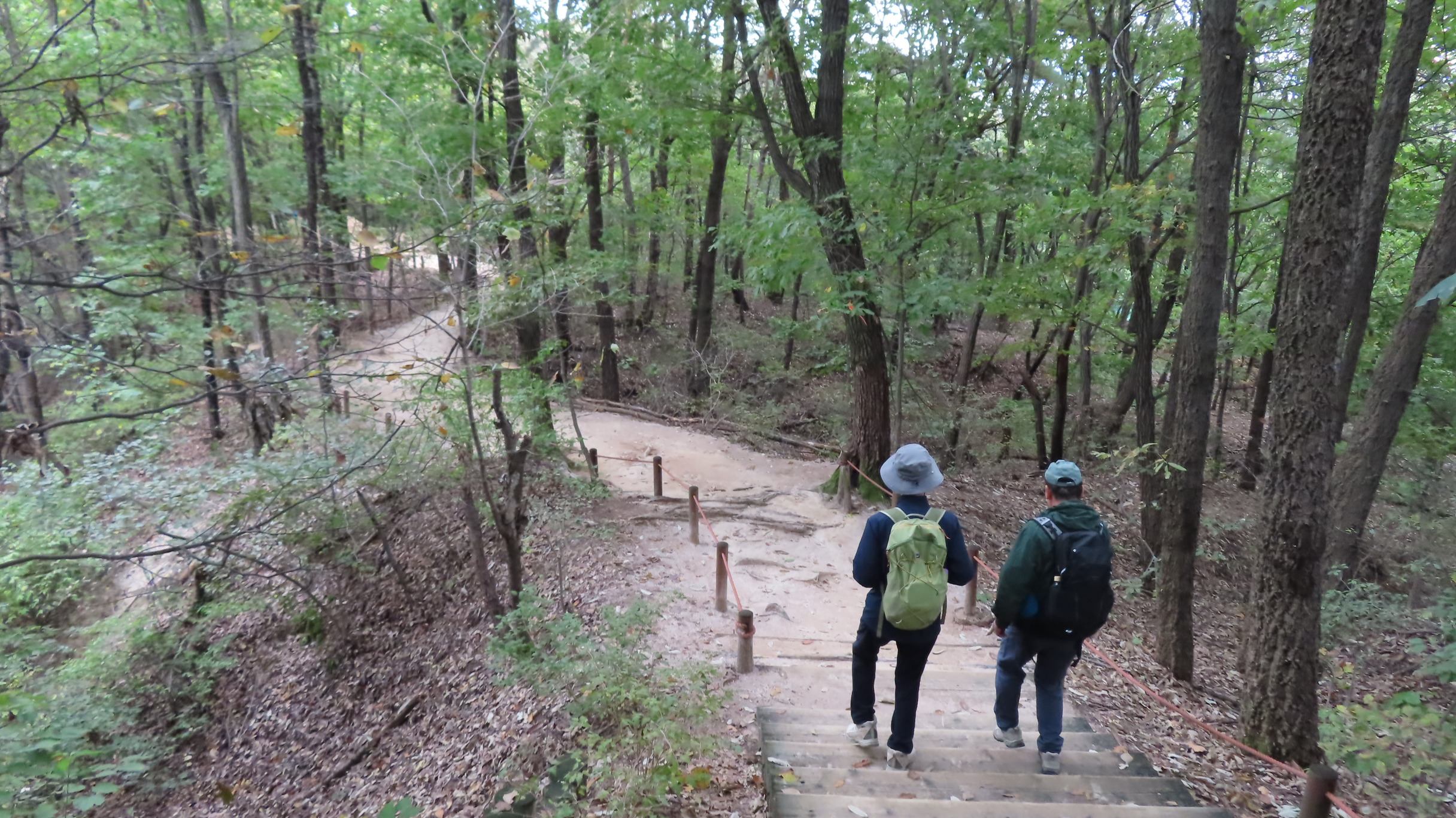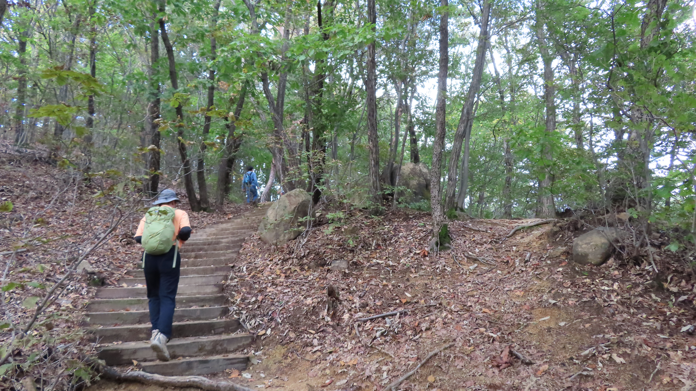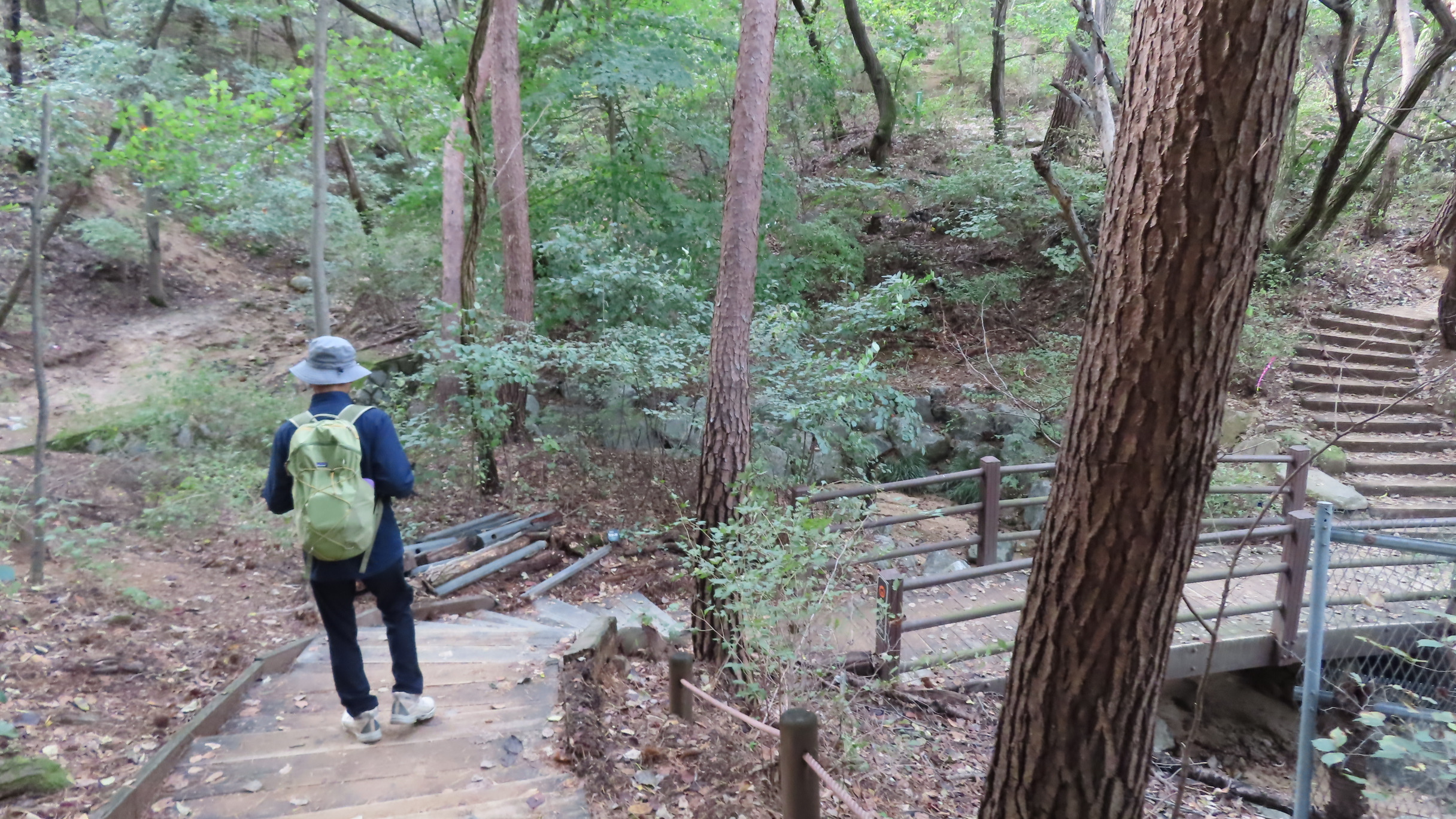 오르막길이 끝나면서 좌측으로 우이암을 올려다 볼 수 있는 쉼터가 있지만 우측으로 이어간다. 곧바로 좌측으로 내리막 계단길이다.
