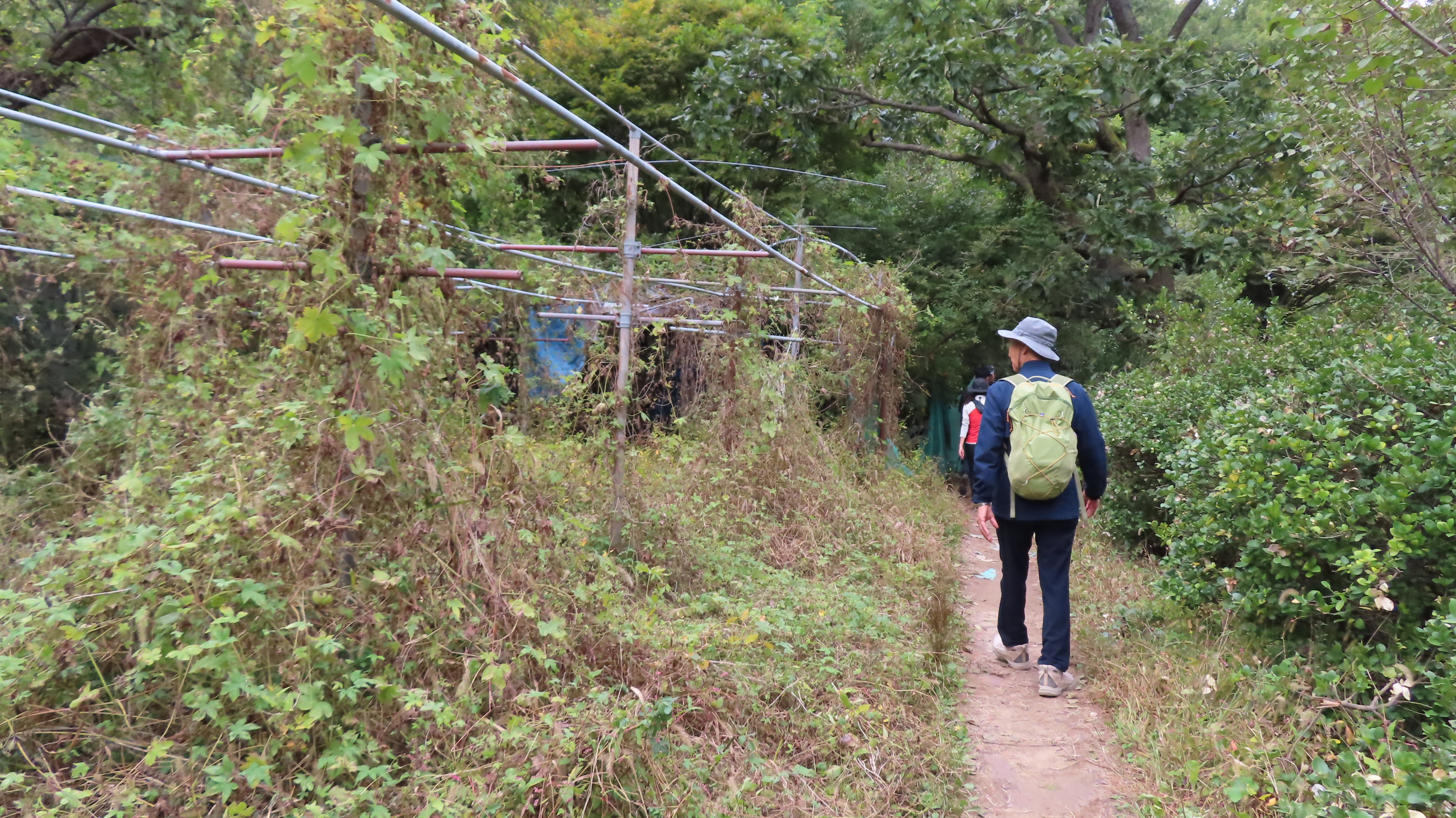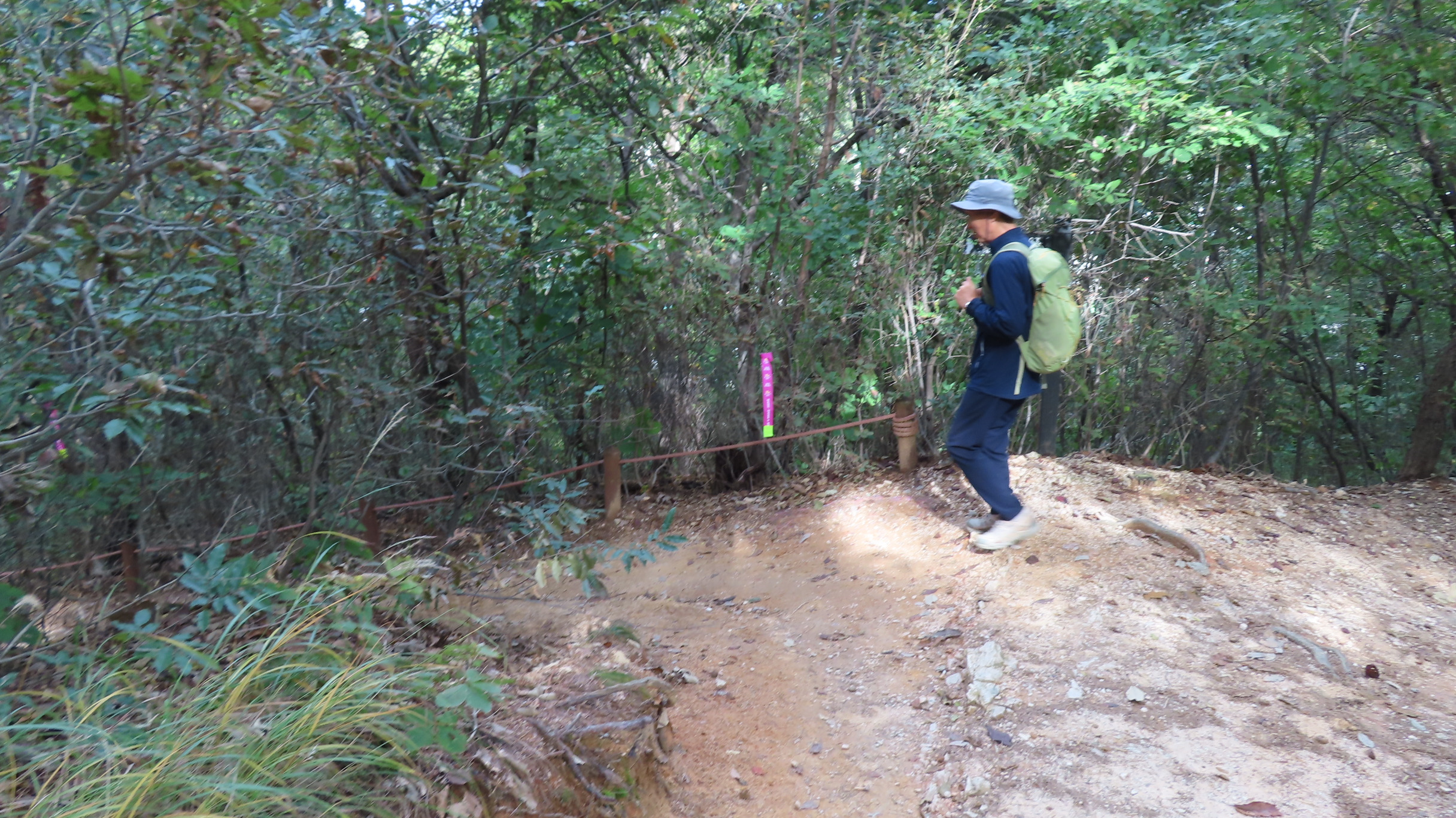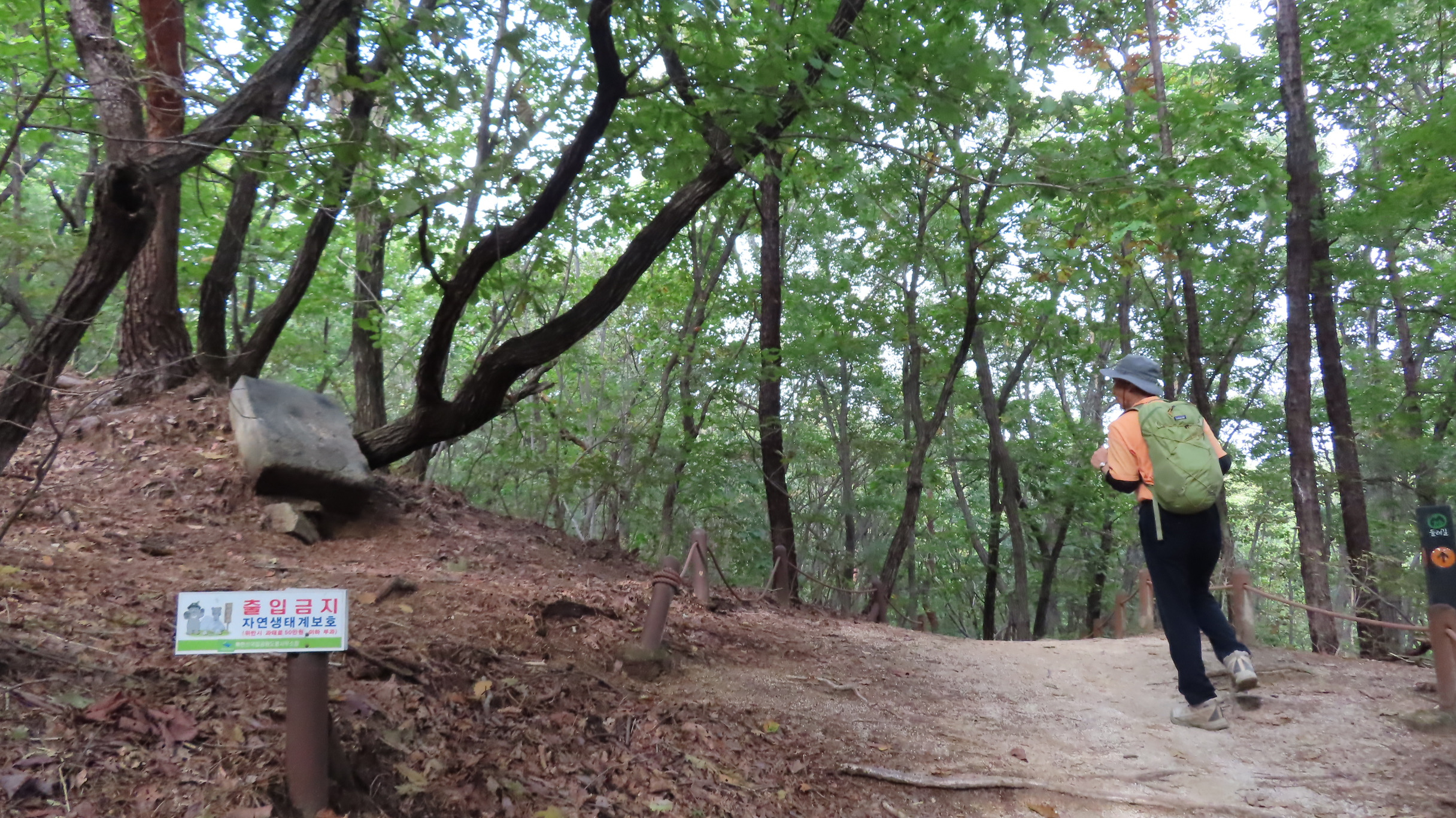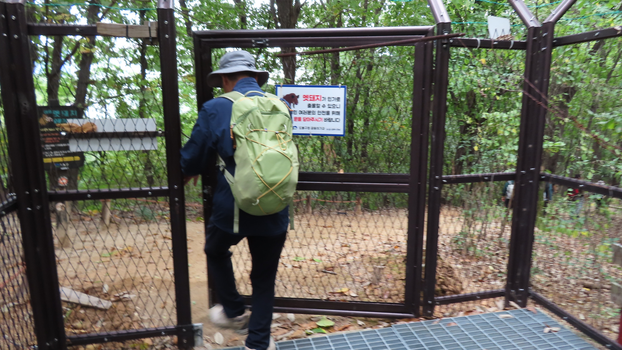 멧돼지 방어용 철책문은 닫쳐있다. 통과 후에는 닫아줘야 한다. 문기둥이 보이고 싱그러운 숲길은 봄이면 철쭉꽃이 군락을 이루는 곳이다. 버려진 듯한 포도밭을 통과한다.