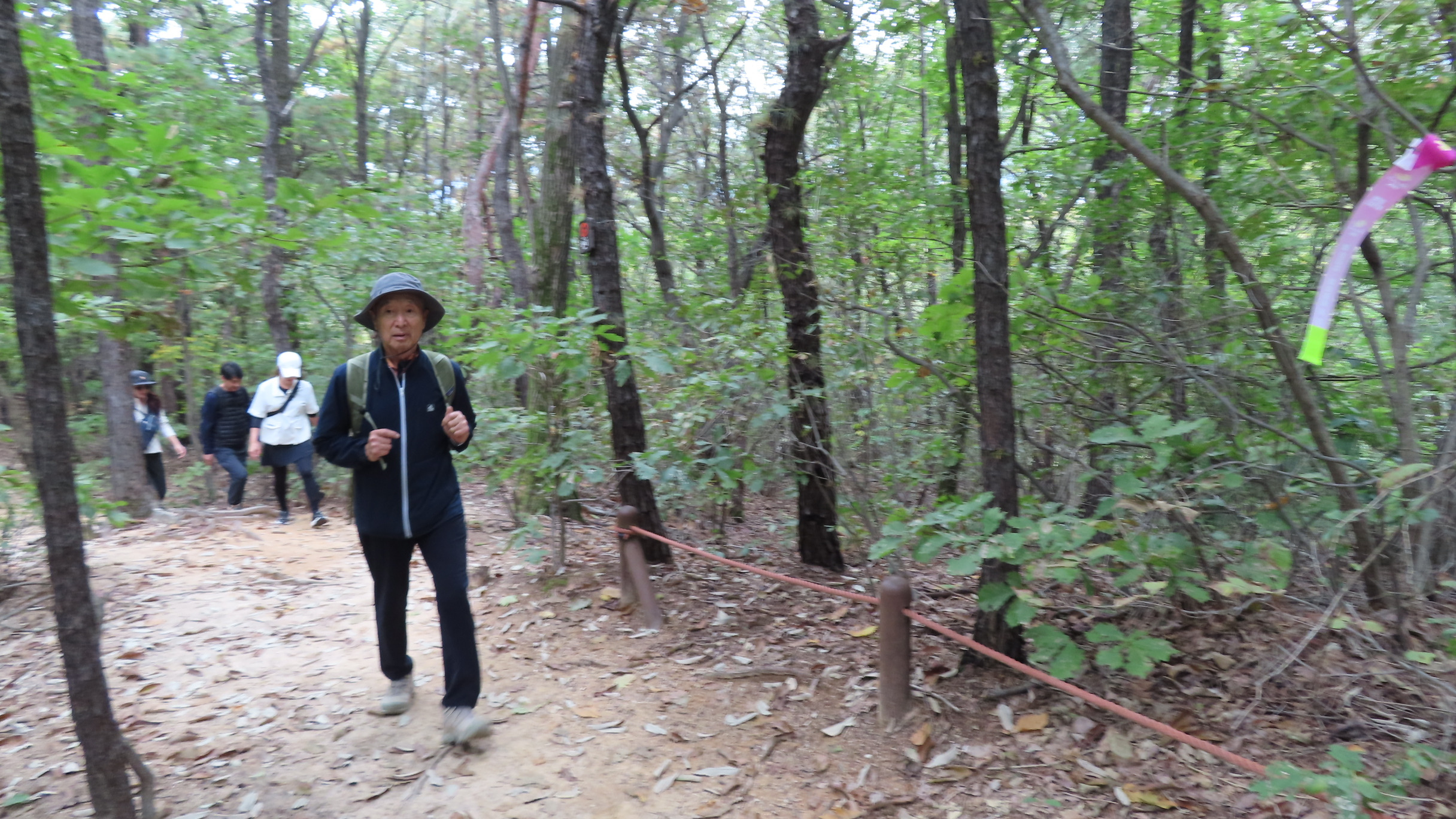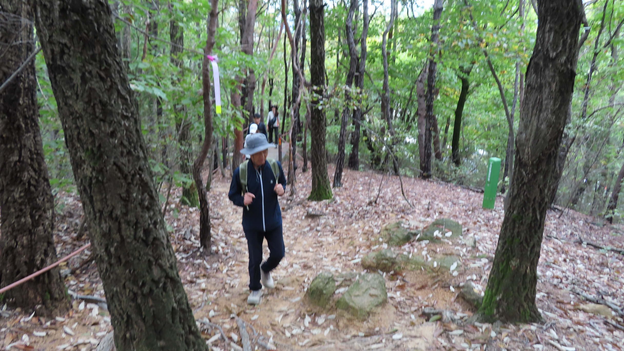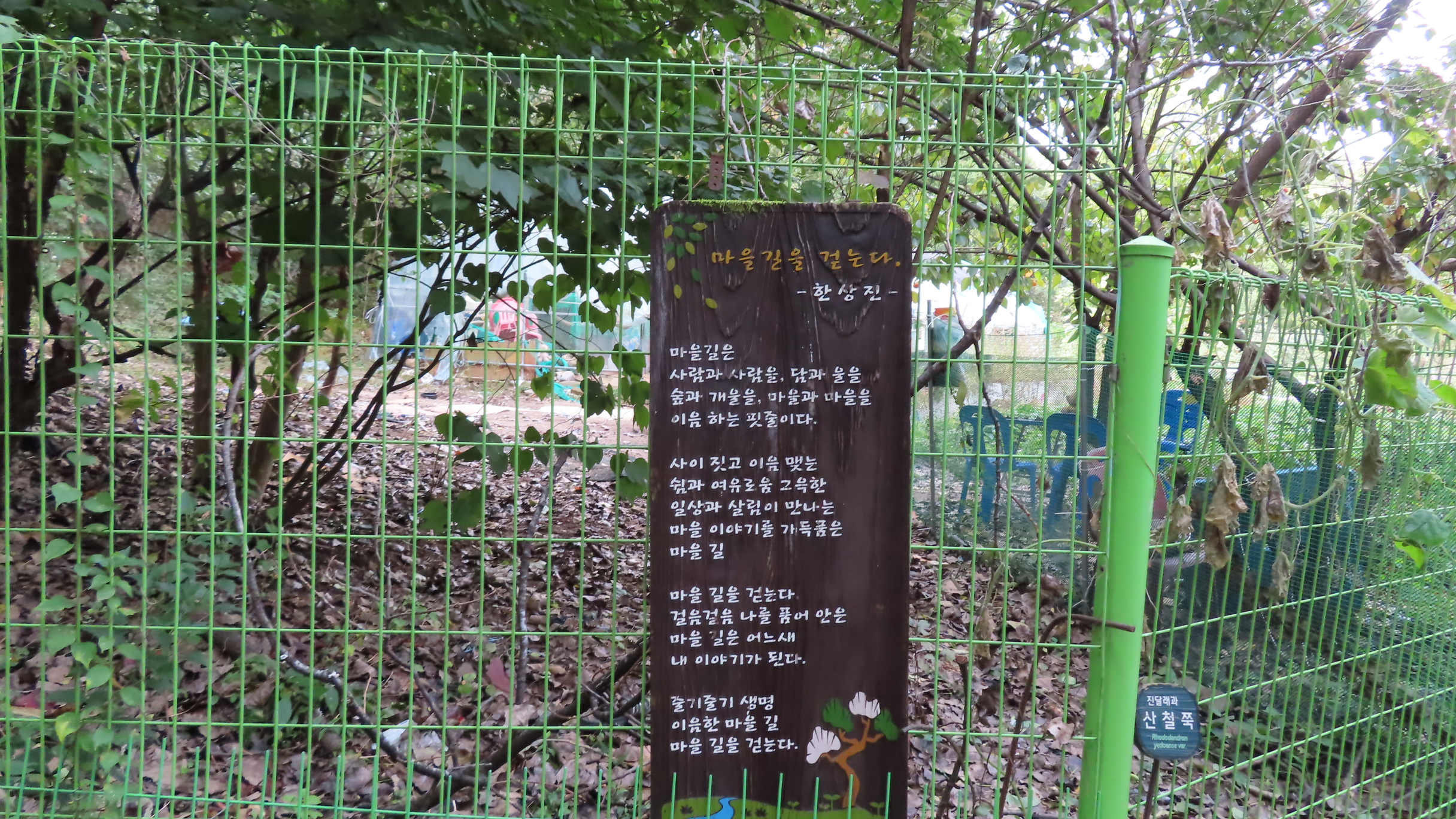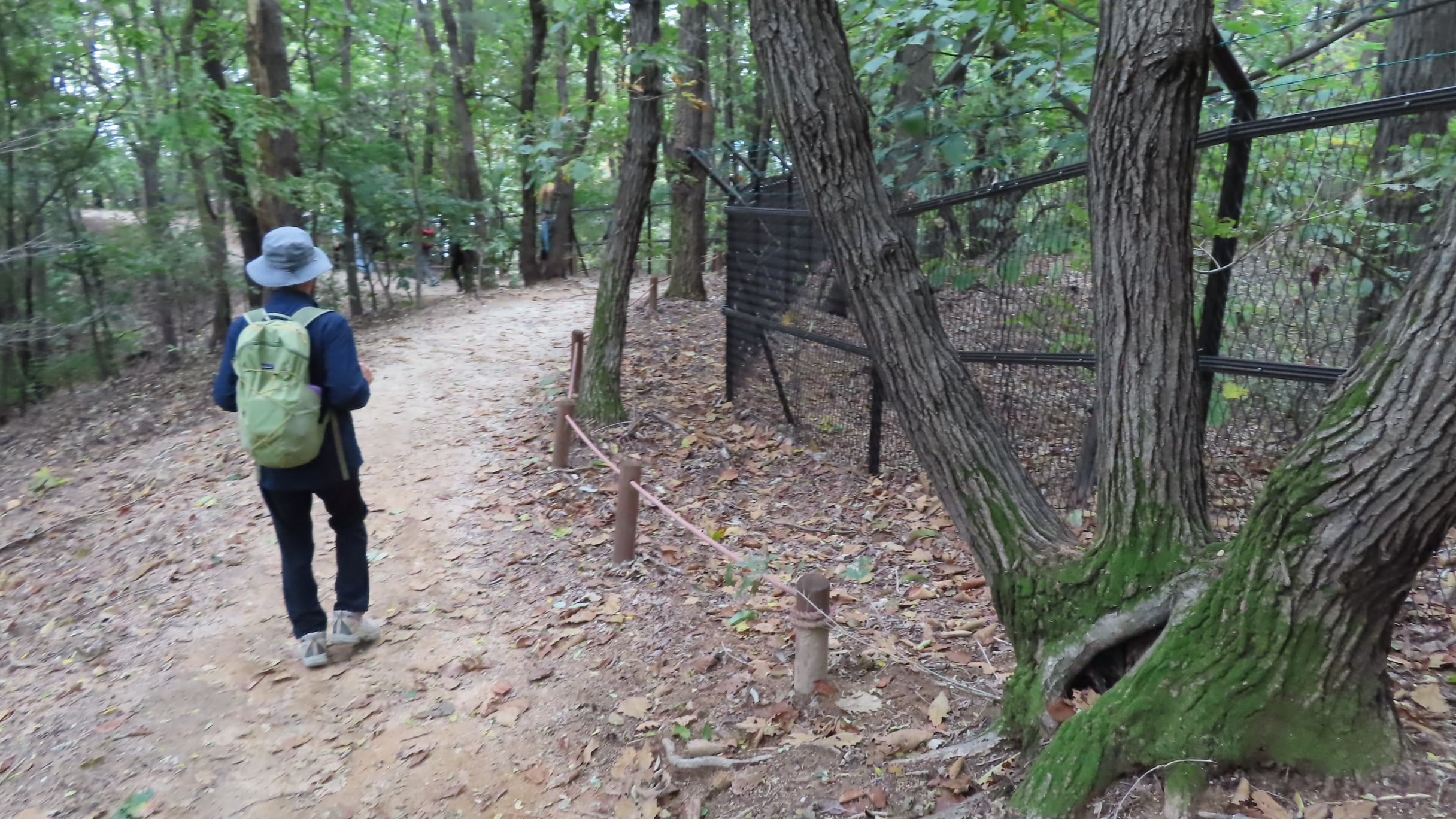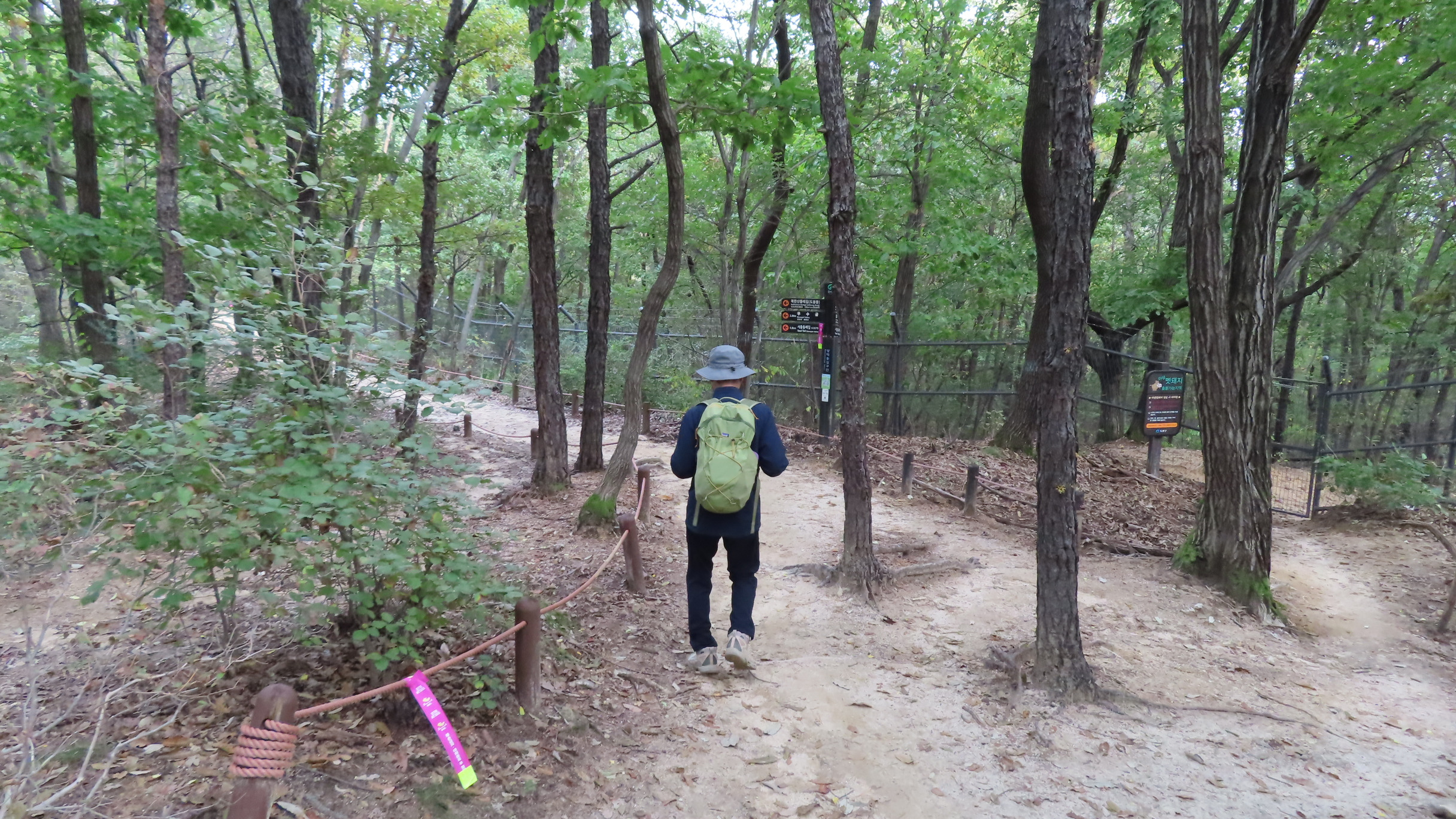 멧돼지 방어용 철책문은 닫쳐있다. 통과 후에는 닫아줘야 한다. 문기둥이 보이고 싱그러운 숲길은 봄이면 철쭉꽃이 군락을 이루는 곳이다. 버려진 듯한 포도밭을 통과한다.