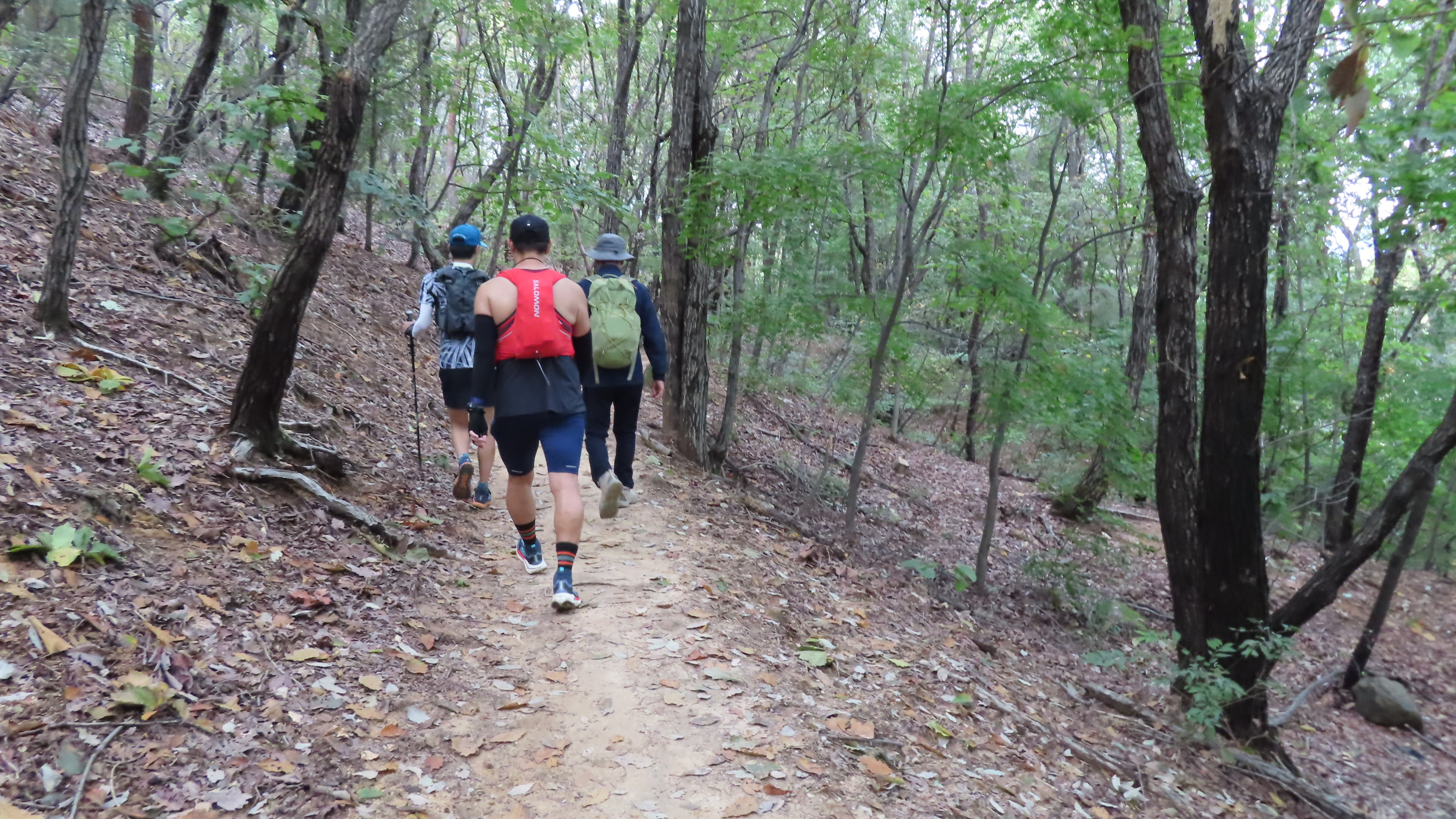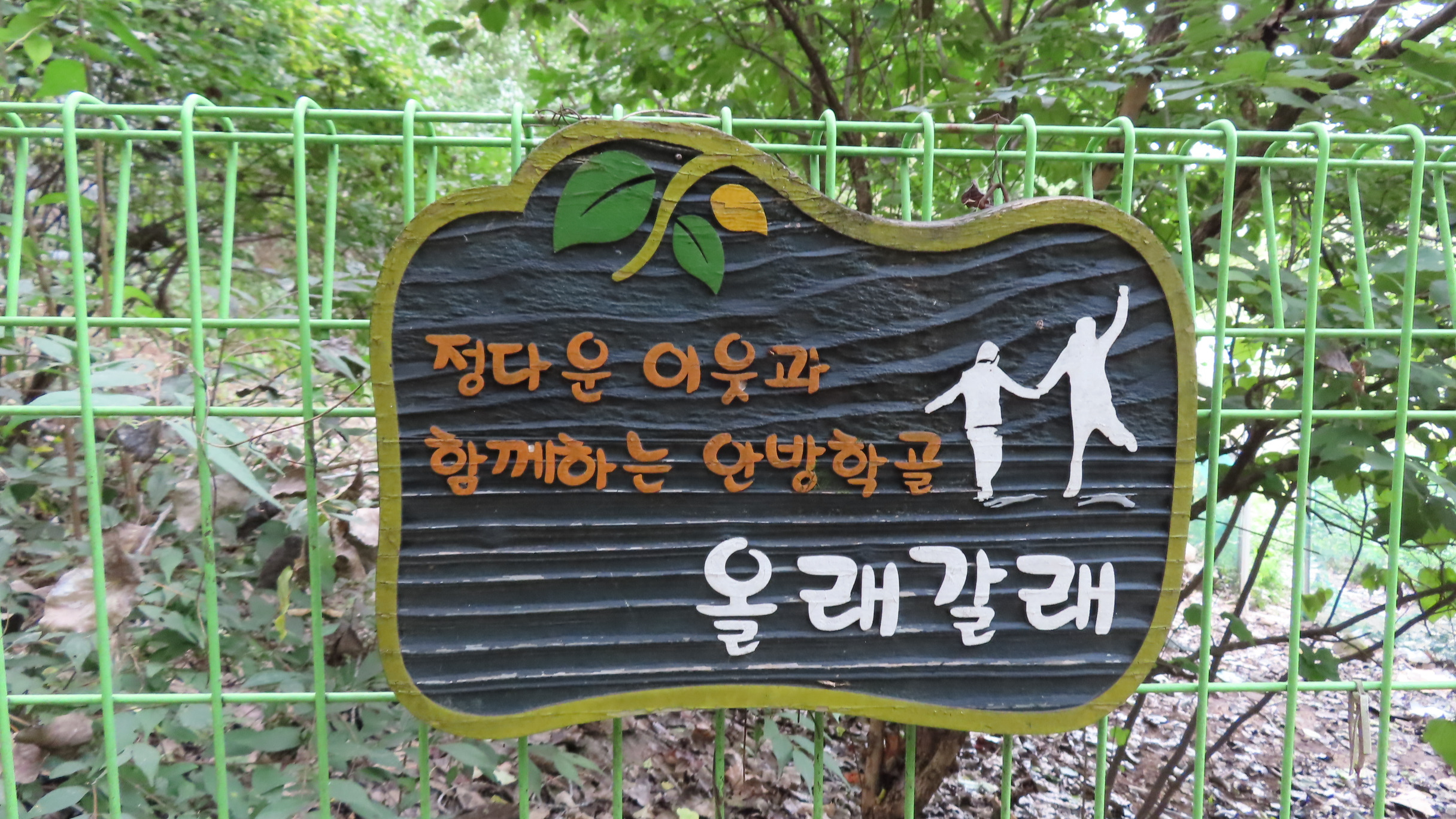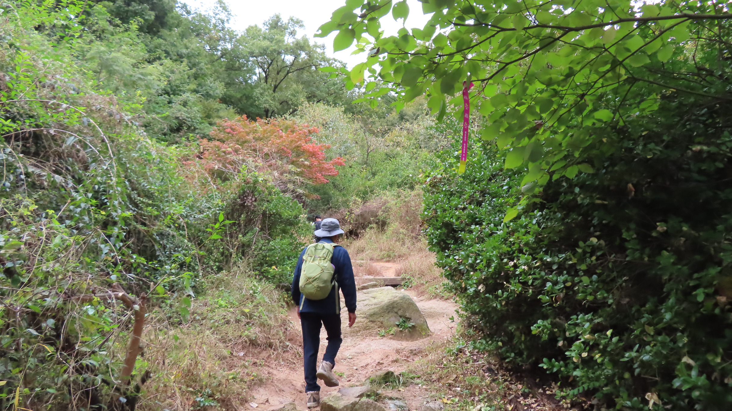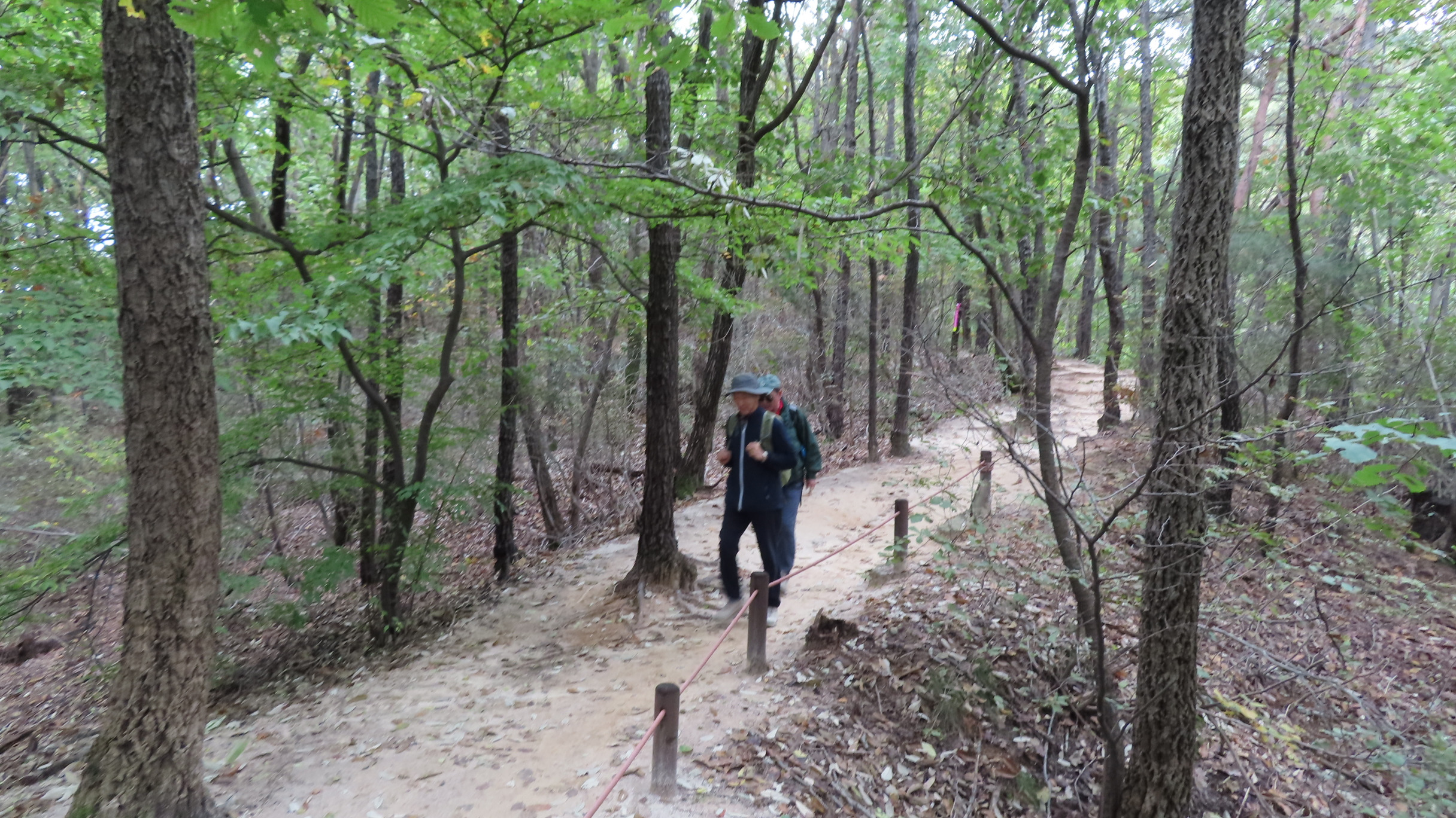 멧돼지 방어용 철책문은 닫쳐있다. 통과 후에는 닫아줘야 한다. 문기둥이 보이고 싱그러운 숲길은 봄이면 철쭉꽃이 군락을 이루는 곳이다. 버려진 듯한 포도밭을 통과한다.