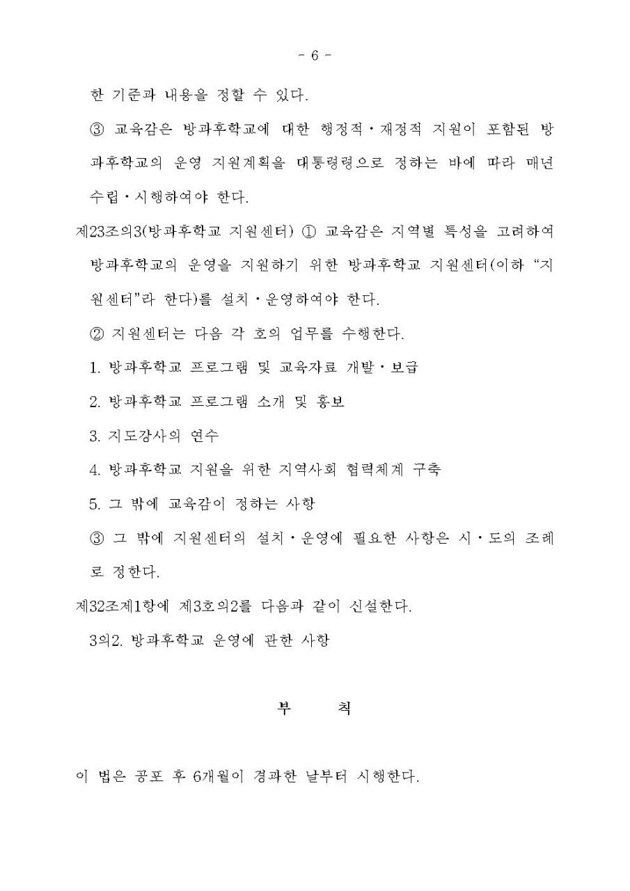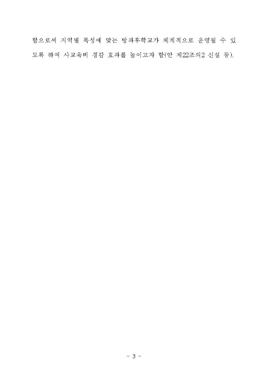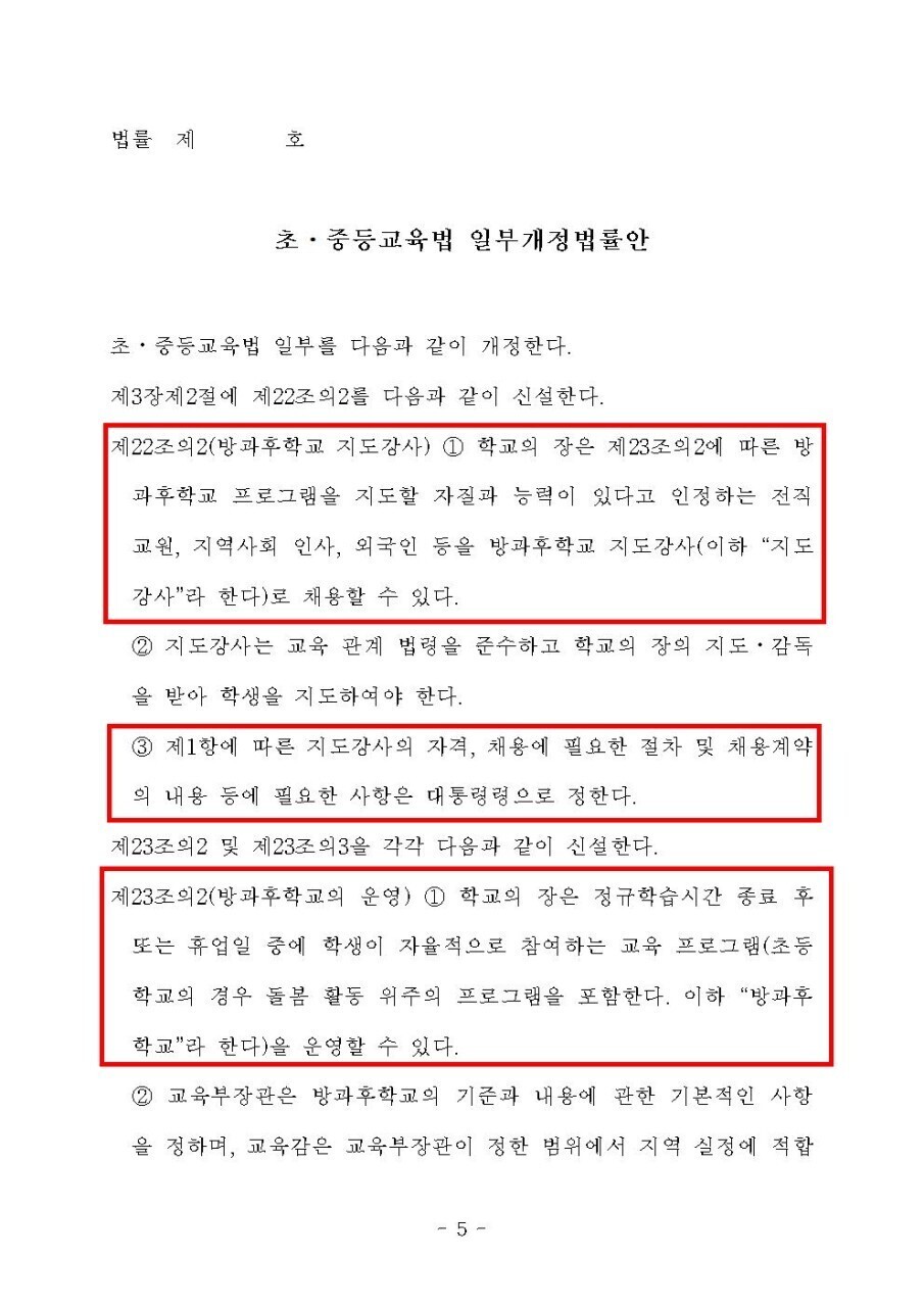 방과후학교를 법제화하여 초중등교육법에 신설하려는 법률안이 발의되었습니다.