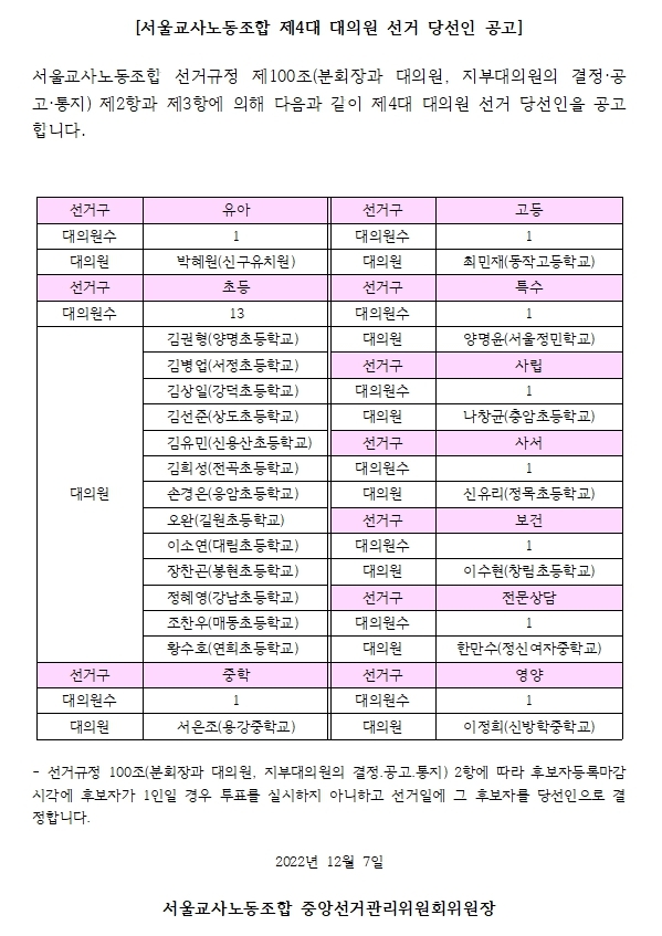 [서울교사노동조합 제4대 대의원 선거 당선인 공고] 작성자김병업(2022 사무처장)|작성시간22.12.07|조회수105 목록 댓글 0 글자크기 작게가 글자크기 크게가 다음검색 현재 게시글 추가 기능 열기 북마크 공유하기 신고 센터로 신고 댓글 댓글 0 댓글쓰기 답글쓰기 댓글 리스트