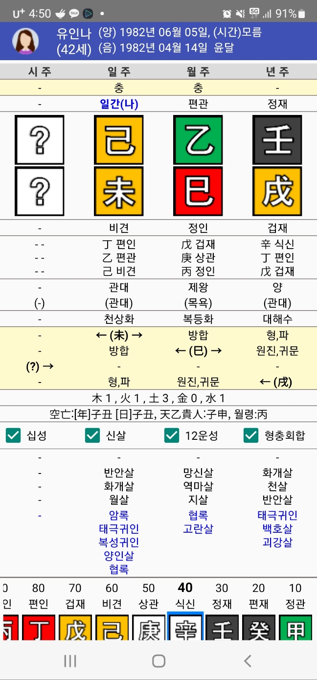 정인격이니 곧바로 정인을 용신으로 잡을까 했지만 양 옆의 비견겁재가 꺼림칙합니다. 편인이나 정인이 월지를 잡았을 때는 비견겁재의 세력을 보아야 합니다. 인성 운이 들어오면 괜히 가만히 있는 비겁을 생하여 오히려 인생이 안하무인으로 흘러갑니다. 유인나는 일지 미토는 그렇다 치고 연지 술토가 있으므로 인성 운이 들어오면 술토를 생하여 흉신 겁재를 생하게 됩니다.