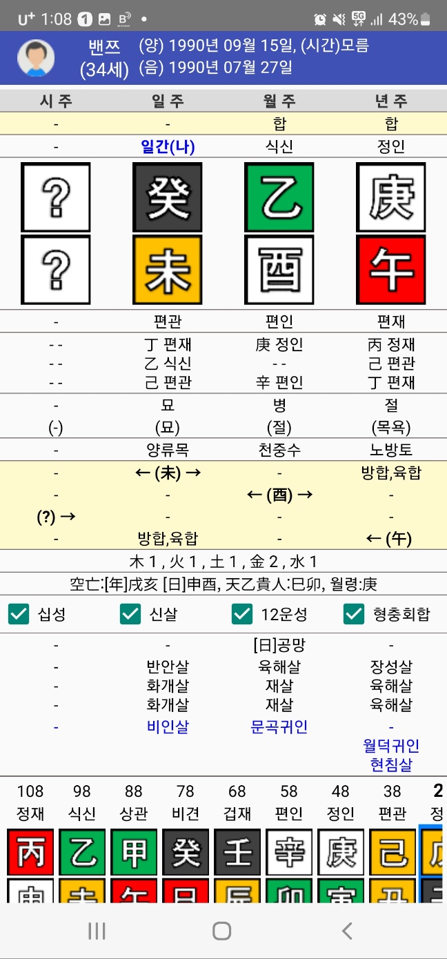 더욱이 천간에 을목 식신과 경금 정인을 투출해 놓았는데 을경합을 하여 정인의 기운으로 화(化)하니 첫인상은 굉장히 준수하고 착해 보이는 이미지가 되었습니다. 즉, 지지는 편인, 편관, 재성으로 흐름이 격동적이고 드라마틱한데 천간은 길신인 식신과 정인으로 되어있으니 타인은 그 복잡한 속사정을 잘 모릅니다.