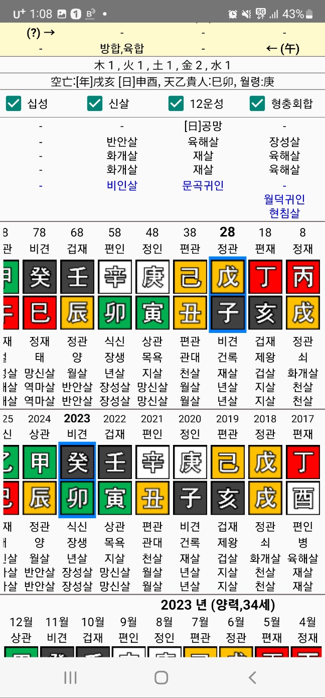 이대로만 갔으면 얼마나 좋을까요. 대운이 무자로 바뀌게 됩니다. 그전까지 정해 대운에서는 천간에 재성이 떠서 그저 컨텐츠 만들고 돈을 버는 것을 목표로 하였으나 무토 정관이 들어오니 일간 계수와 합을 하면서 관성(시스템)의 힘으로 지속적인 수익을 얻을 수 있는 사업으로 생각이 뻗게 됩니다. 그런데 지지에서 들어온 자수는 밴쯔에게 호의를 베풀지 않았습니다. 그것은 해수와는 달리 미토와 삼합을 하지 않아 그대로 오화와 자오충을 하게 됩니다. 중요한 역할을 하던 재성을 대운에서 들어온 비견이 충하는 중 세운에서도 수기운이 강해지는 2018~2019(기해년) 에 사건을 터트리게 됩니다.