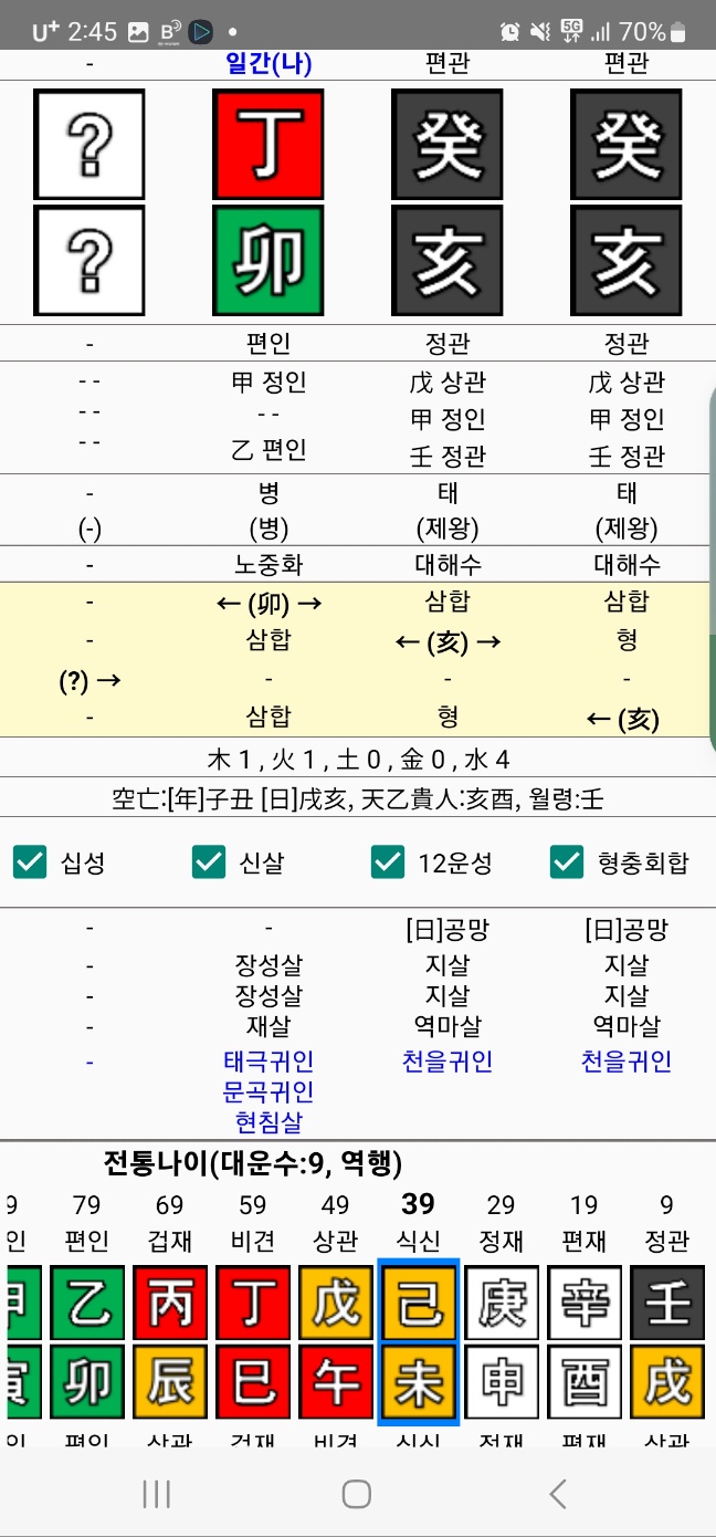 그러므로 귀하디 귀한 정관을 용신답게 못 쓰는 한이 맺혀 이 사람은 사회생활을 제대로 못 하는 열등감을 알콜로 해소한 것으로 보인다.