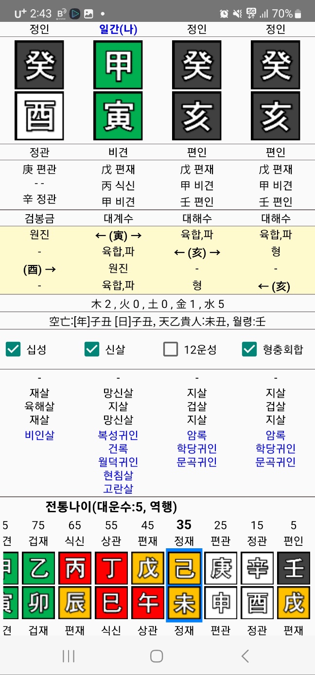 연월이 계해, 계해로 물바다를 이루었다. 넘쳐나는 수의 기운을 감당해내기가 어렵다. 인목 지장간에 있는 무토(戊)만으로는 막을 수 없는 쓰나미다.