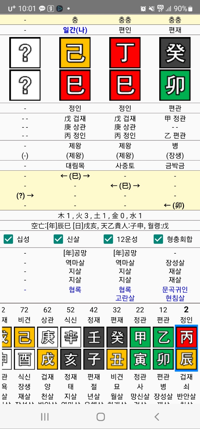 천간으로는 편인, 편재가 투출해 있으니 겉으로는 시크한 척 한다. 그러나 마음은 정인답게 매우 여리다. 상처 안 받을 것처럼 쿨한 척 하지만 실제로는 남에 말에 크게 신경쓴다.