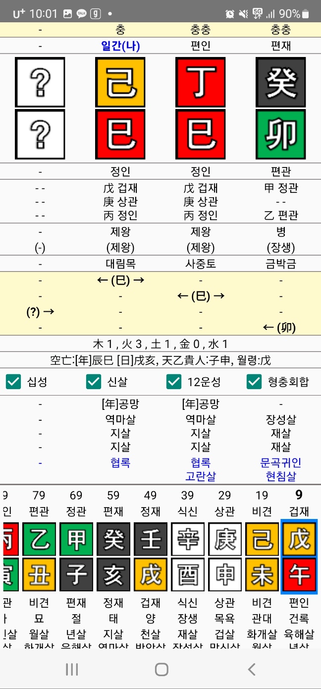 철이 들기 위해서는 재성의 운을 기다리는데 거의 인생 말년에서야 재성을 보니 미친다. 당연히 시주에는 부족한 현실감각을 일깨우고 일간을 제어하기 위하여 21:30~23:30 출생하는 을해(편관, 정재)를 놓는 것이 좋겠다. 사해충이 되더라도 이것이 낫다.